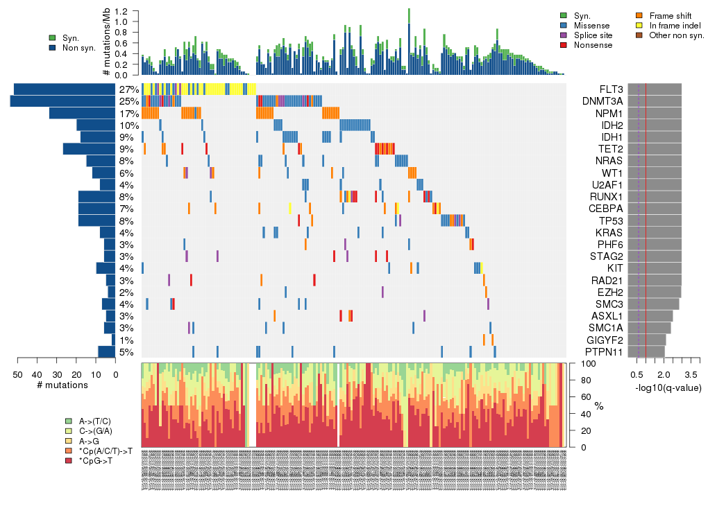 Figure 3. Get High-res Image The matrix in the center of the figure represents individual mutations in patient samples, color-coded by type of mutation, for the significantly mutated genes. The rate of synonymous and non-synonymous mutations is displayed at the top of the matrix. The barplot on the left of the matrix shows the number of mutations in each gene. The percentages represent the fraction of tumors with at least one mutation in the specified gene. The barplot to the right of the matrix displays the q-values for the most significantly mutated genes. The purple boxplots below the matrix (only displayed if required columns are present in the provided MAF) represent the distributions of allelic fractions observed in each sample. The plot at the bottom represents the base substitution distribution of individual samples, using the same categories that were used to calculate significance.