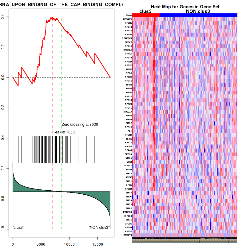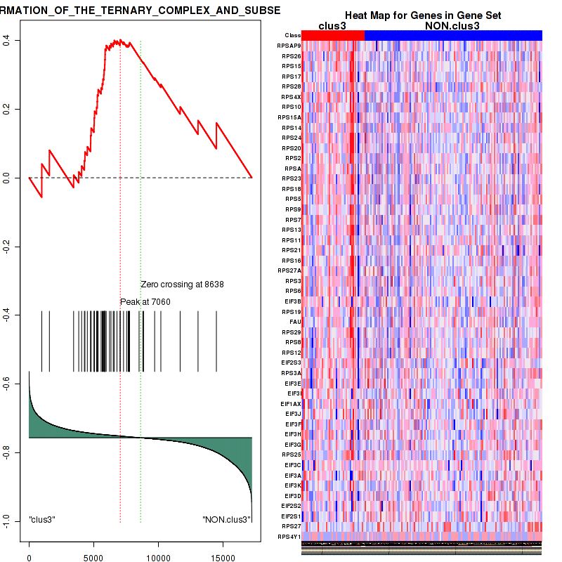 Figure S59. Get High-res Image This plot shows mRNAseq_cNMF expression data heatmap (on the left) a RunningEnrichmentScore(RES) plot (on the top right) and a Signal2Noise(S2N) plot (on the bottom right) of genes in the pathway: REACTOME PEPTIDE CHAIN ELONGATION.