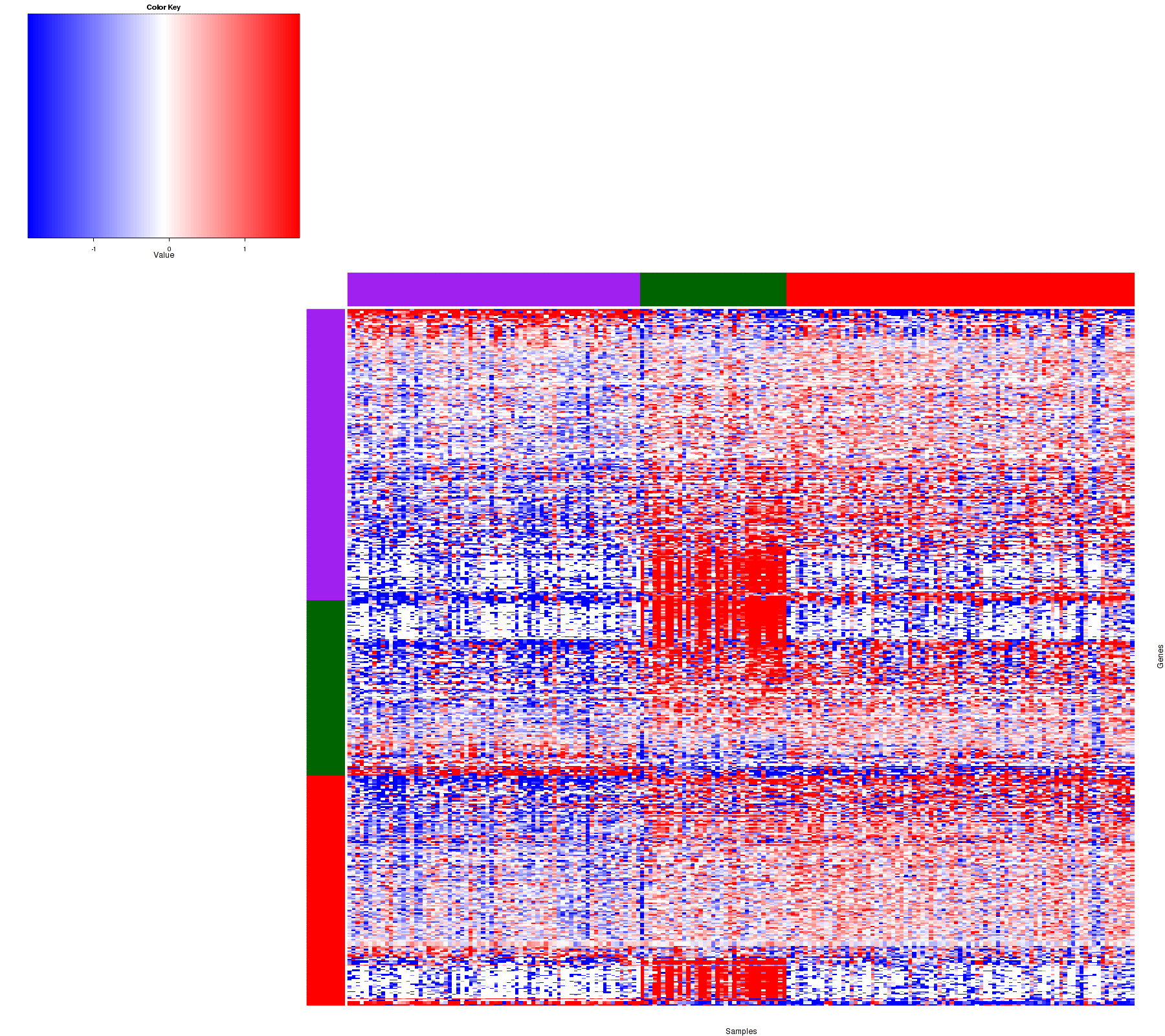 Figure 1. Get High-res Image Samples were separated into 3 clusters. Shown are 188 samples and 479 marker miRs. The color bar of the row indicates the marker miRs for the corresponding cluster.