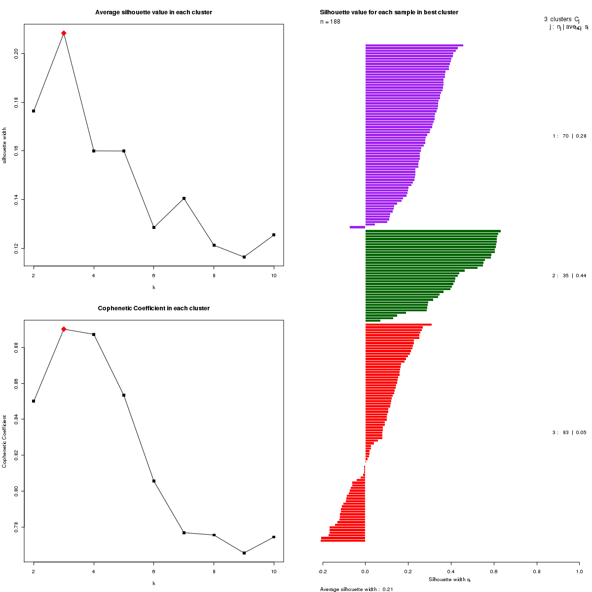 Figure 3. Get High-res Image The silhouette width was calculated for each sample and each value of k. The left upper panel shows the average silhouette width across all samples for each tested k (left upper panel). The left lower panel shows the Cophenetic Correlation Coefficients for each tested k. The right panel shows assignments of clusters to samples and the k silhouette width of each sample for the most robust clustering.