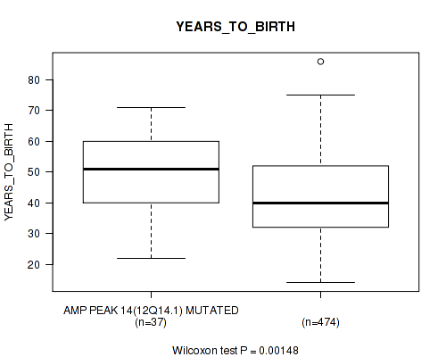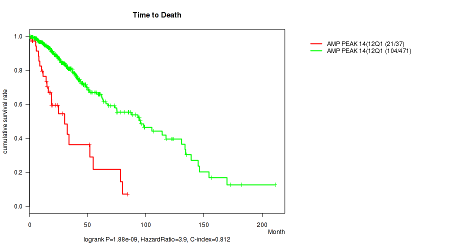 amp_12q14.1 cnv correlated to 'Time to Death', 'YEARS_TO_BIRTH', 'RADIATION_THERAPY', and 'HISTOLOGICAL_TYPE'.