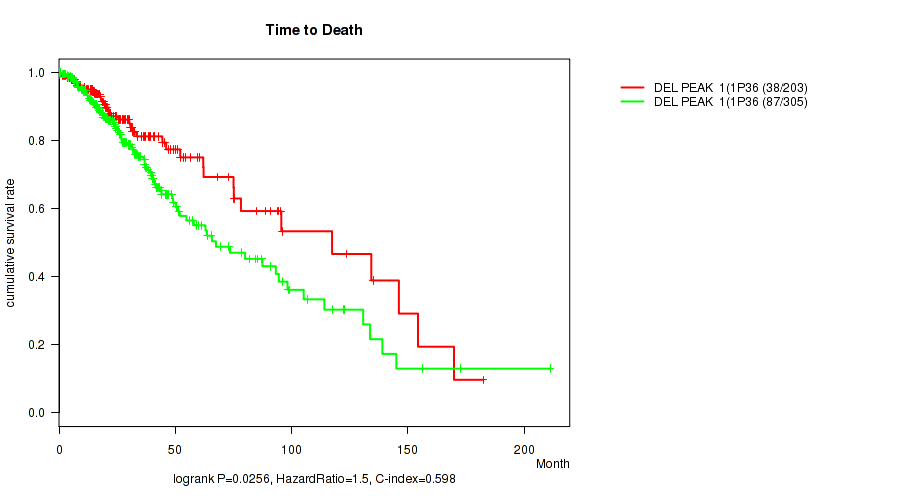 del_1p36.32 cnv correlated to 'Time to Death', 'YEARS_TO_BIRTH', 'RADIATION_THERAPY', and 'HISTOLOGICAL_TYPE'.