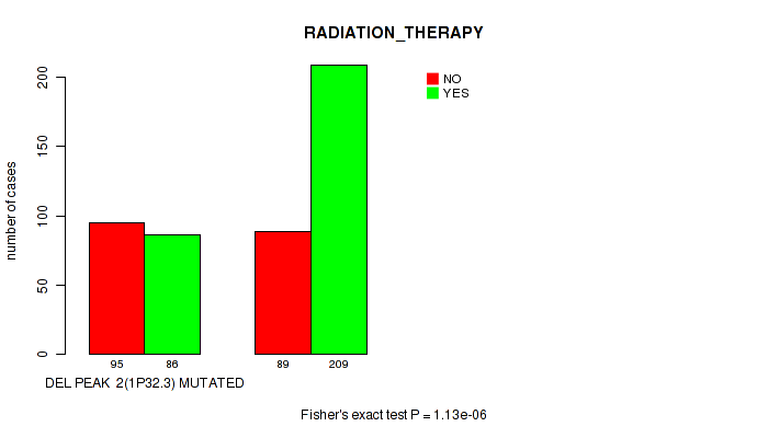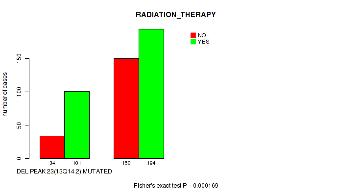 Figure S120. Get High-res Image Gene #43: 'del_13q14.2' versus Clinical Feature #4: 'RADIATION_THERAPY'