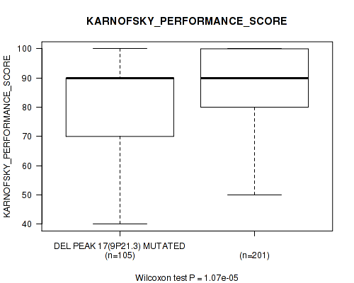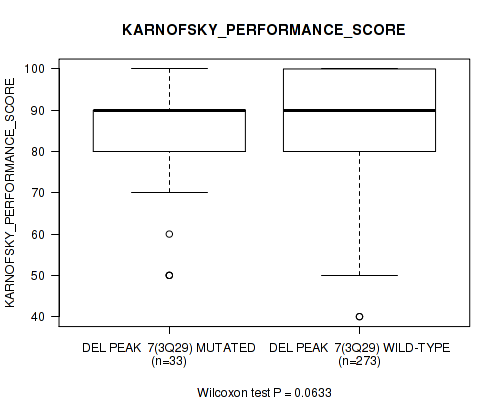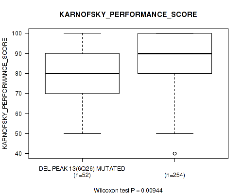Figure S121. Get High-res Image Gene #43: 'del_13q14.2' versus Clinical Feature #5: 'KARNOFSKY_PERFORMANCE_SCORE'
