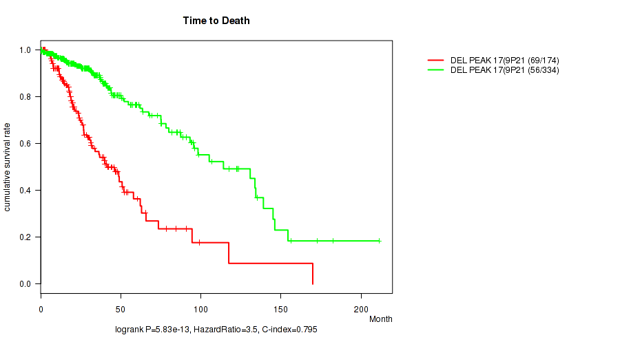 del_9p21.3 cnv correlated to 'Time to Death', 'YEARS_TO_BIRTH', 'RADIATION_THERAPY', 'KARNOFSKY_PERFORMANCE_SCORE', and 'HISTOLOGICAL_TYPE'.