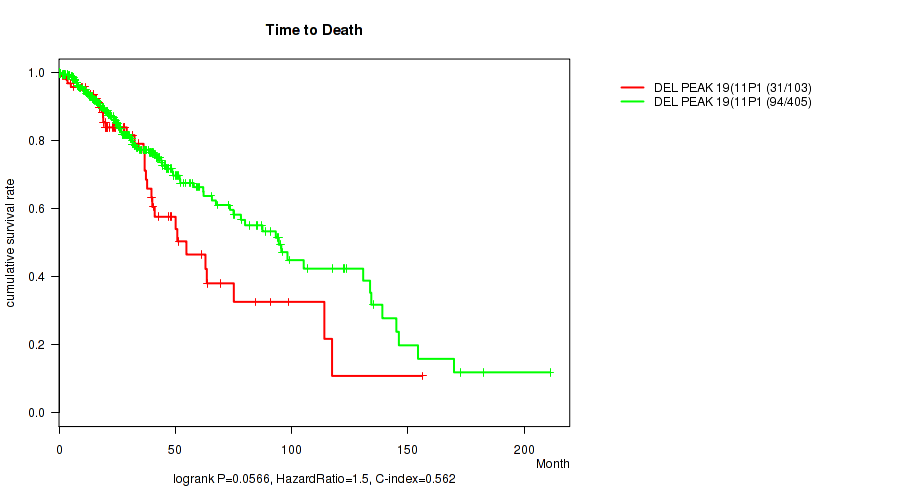 Figure S129. Get High-res Image Gene #47: 'del_19q13.42' versus Clinical Feature #1: 'Time to Death'