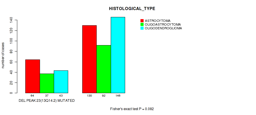 Figure S122. Get High-res Image Gene #43: 'del_13q14.2' versus Clinical Feature #6: 'HISTOLOGICAL_TYPE'