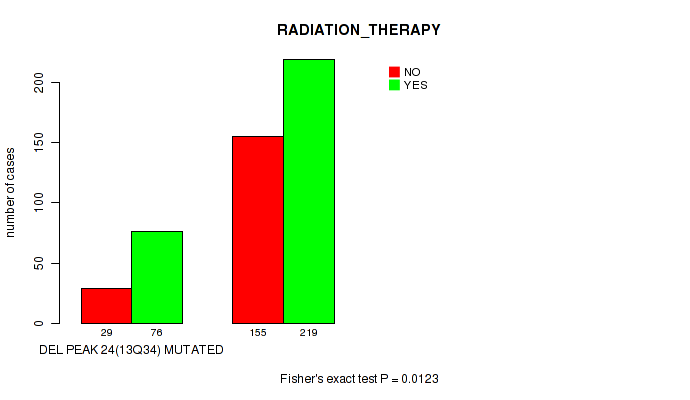 Figure S124. Get High-res Image Gene #44: 'del_13q34' versus Clinical Feature #4: 'RADIATION_THERAPY'