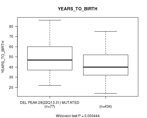 Figure S133. Get High-res Image Gene #48: 'del_22q13.31' versus Clinical Feature #2: 'YEARS_TO_BIRTH'
