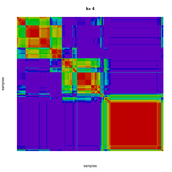Figure 4. Get High-res Image The consensus matrix after clustering shows 4 clusters with limited overlap between clusters.