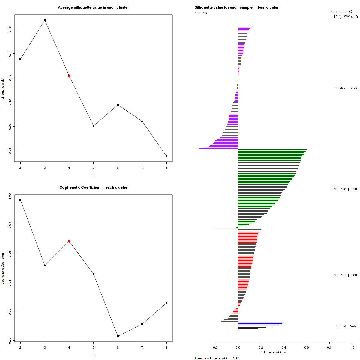 Figure 3. Get High-res Image The silhouette width was calculated for each sample and each value of k. The left upper panel shows the average silhouette width across all samples for each tested k (left upper panel). The left lower panel shows the Cophenetic Correlation Coefficients for each tested k. The right panel shows assignments of clusters to samples and the silhouette width of each sample for the most robust clustering.