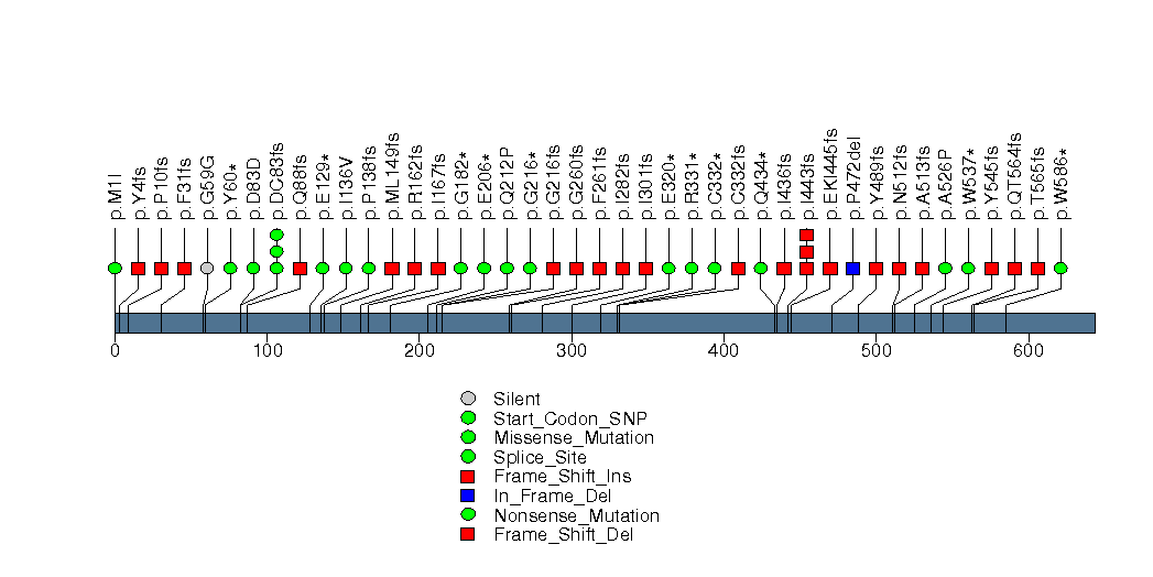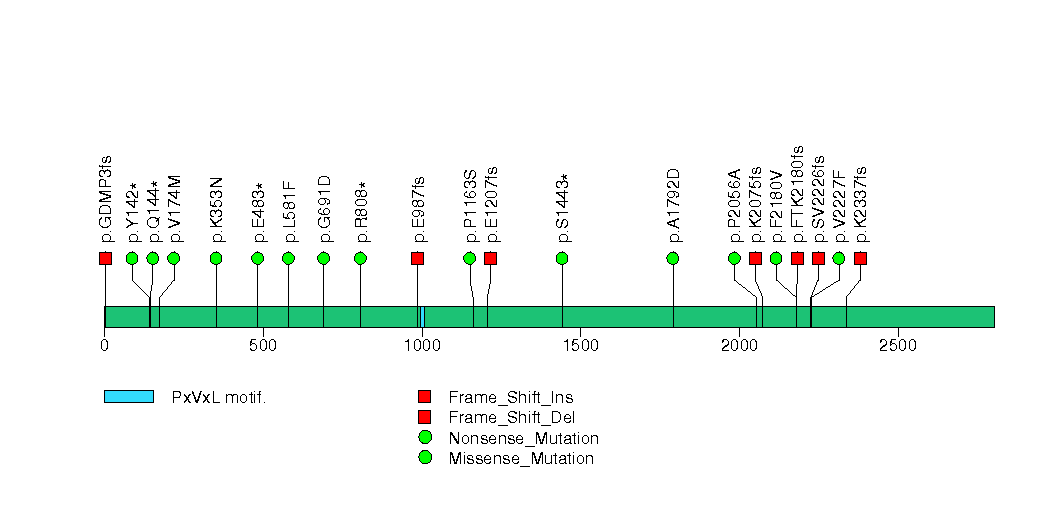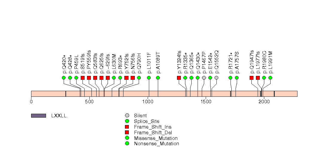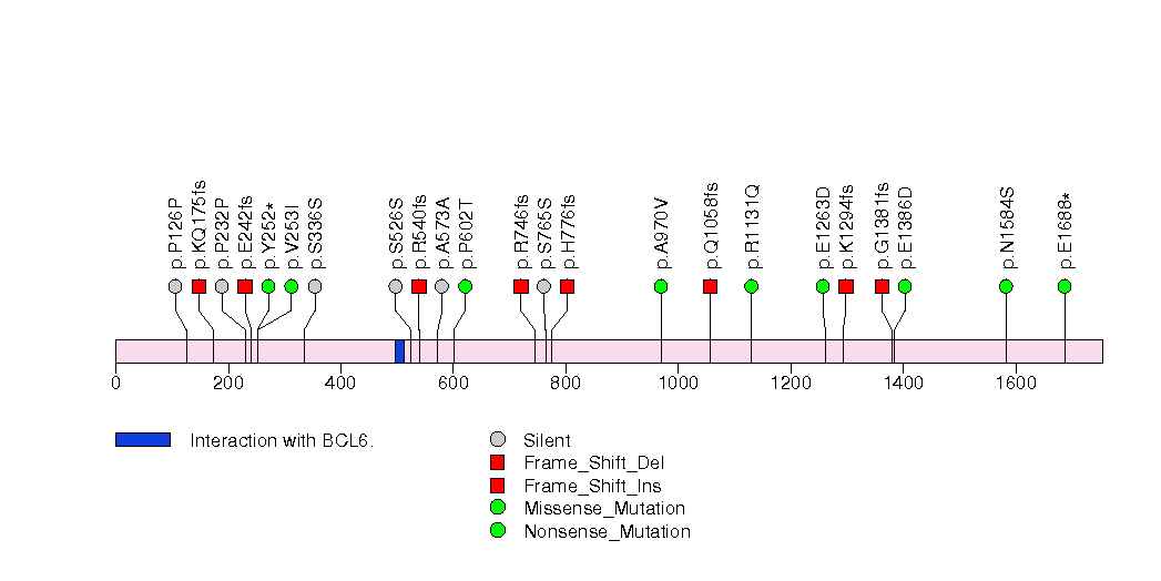Figure S16. This figure depicts the distribution of mutations and mutation types across the BCOR significant gene.