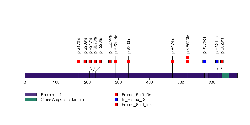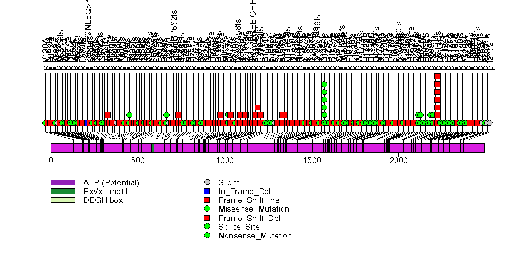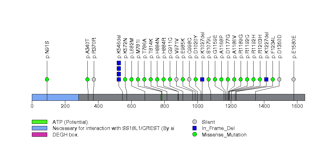 Figure S14. This figure depicts the distribution of mutations and mutation types across the SMARCA4 significant gene.