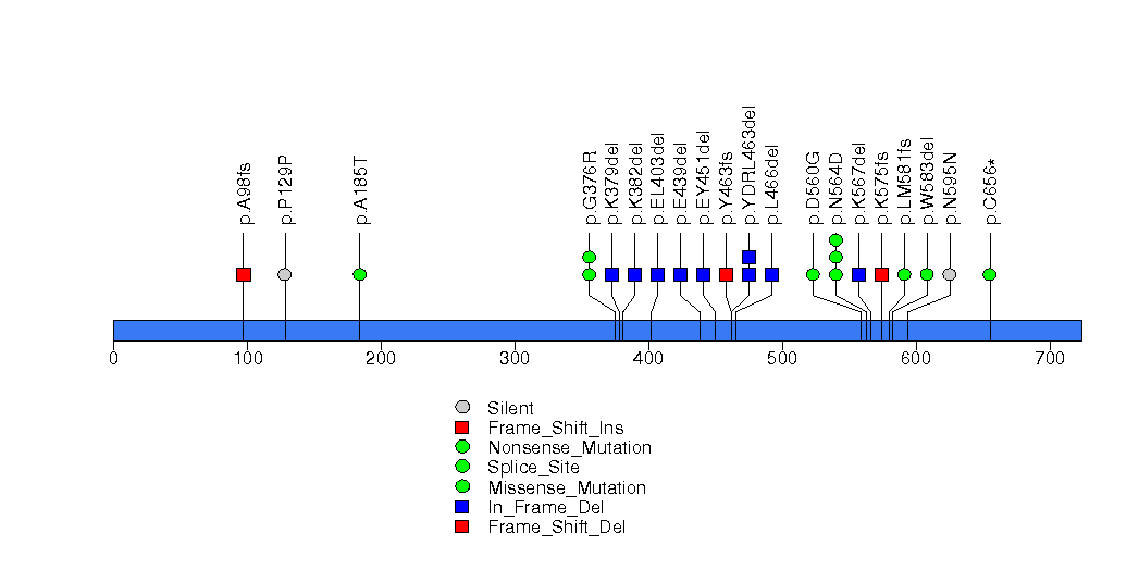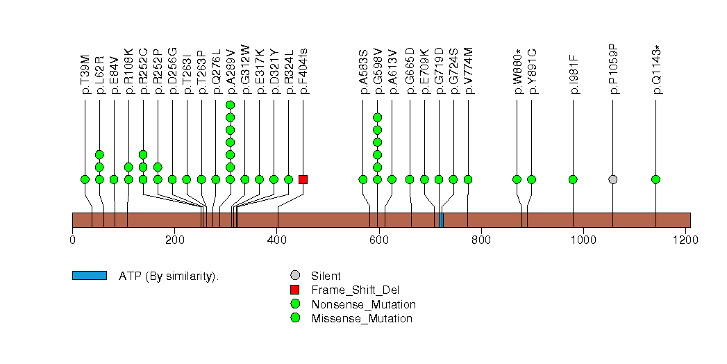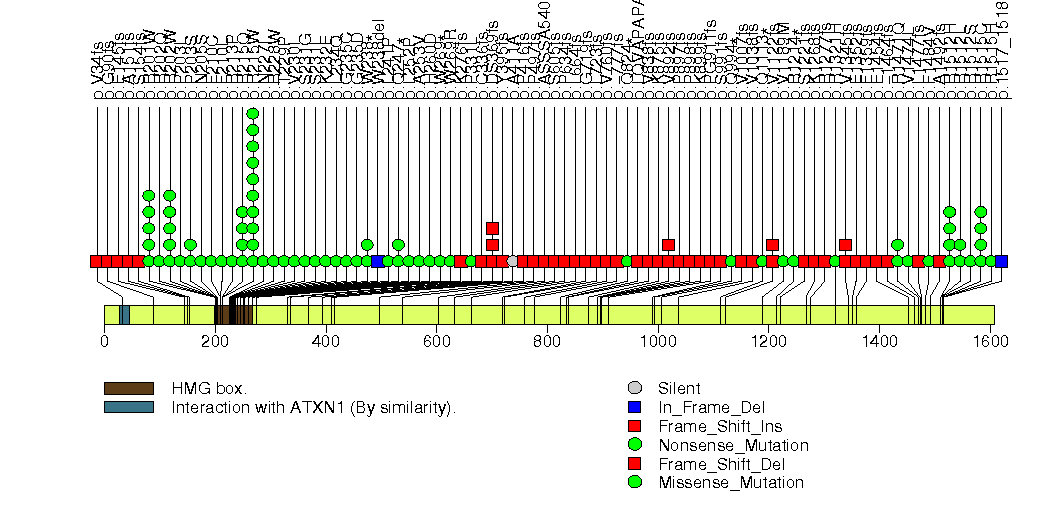 Figure S7. This figure depicts the distribution of mutations and mutation types across the ATRX significant gene.