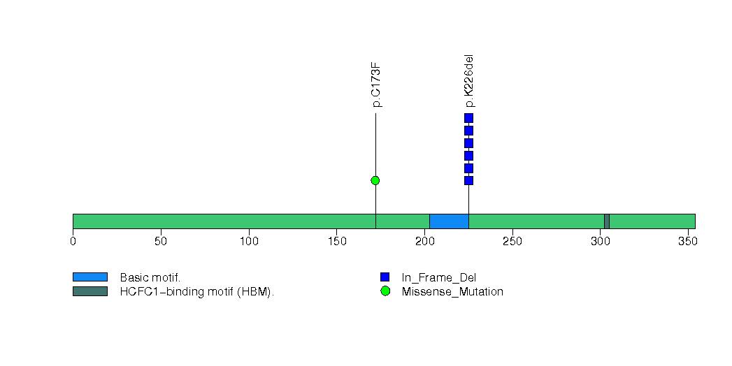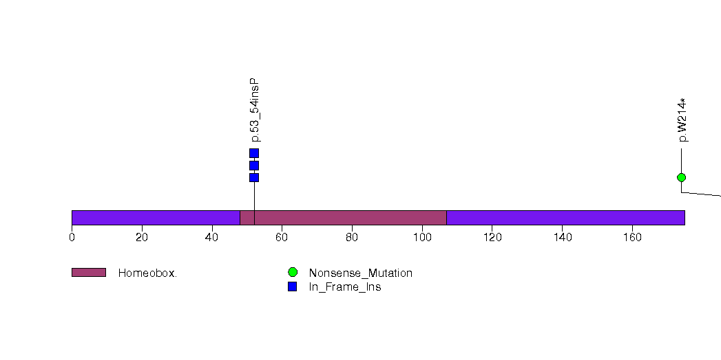 Figure S21. This figure depicts the distribution of mutations and mutation types across the NKX2-2 significant gene.