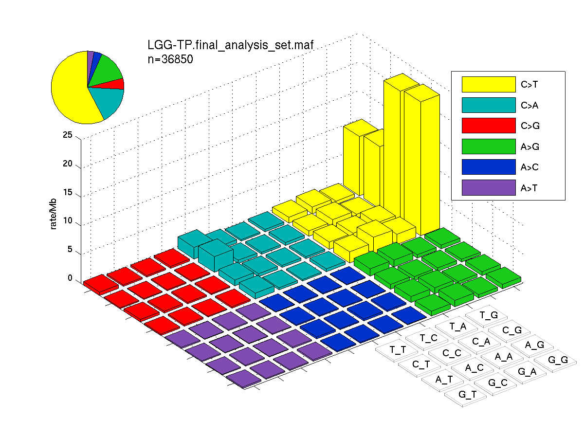 Figure 3. Get High-res Image SNV Mutation rate lego plot for entire set. Each bin is normalized by base coverage for that bin. Colors represent the six SNV types on the upper right. The three-base context for each mutation is labeled in the 4x4 legend on the lower right. The fractional breakdown of SNV counts is shown in the pie chart on the upper left. If this figure is blank, not enough information was provided in the MAF to generate it.
