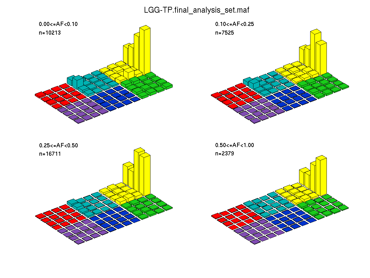 Figure 4. Get High-res Image SNV Mutation rate lego plots for 4 slices of mutation allele fraction (0<=AF<0.1, 0.1<=AF<0.25, 0.25<=AF<0.5, & 0.5<=AF) . The color code and three-base context legends are the same as the previous figure. If this figure is blank, not enough information was provided in the MAF to generate it.
