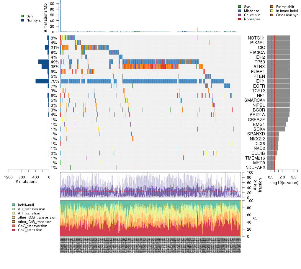 Figure 5. Get High-res Image The matrix in the center of the figure represents individual mutations in patient samples, color-coded by type of mutation, for the significantly mutated genes. The rate of synonymous and non-synonymous mutations is displayed at the top of the matrix. The barplot on the left of the matrix shows the number of mutations in each gene. The percentages represent the fraction of tumors with at least one mutation in the specified gene. The barplot to the right of the matrix displays the q-values for the most significantly mutated genes. The purple boxplots below the matrix (only displayed if required columns are present in the provided MAF) represent the distributions of allelic fractions observed in each sample. The plot at the bottom represents the base substitution distribution of individual samples, using the same categories that were used to calculate significance.