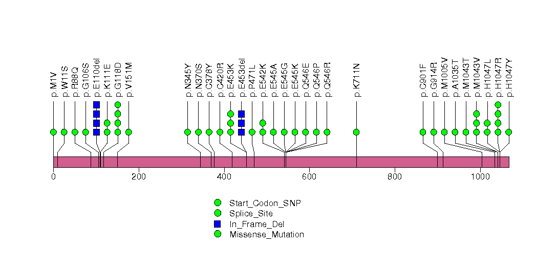Figure S4. This figure depicts the distribution of mutations and mutation types across the PIK3CA significant gene.