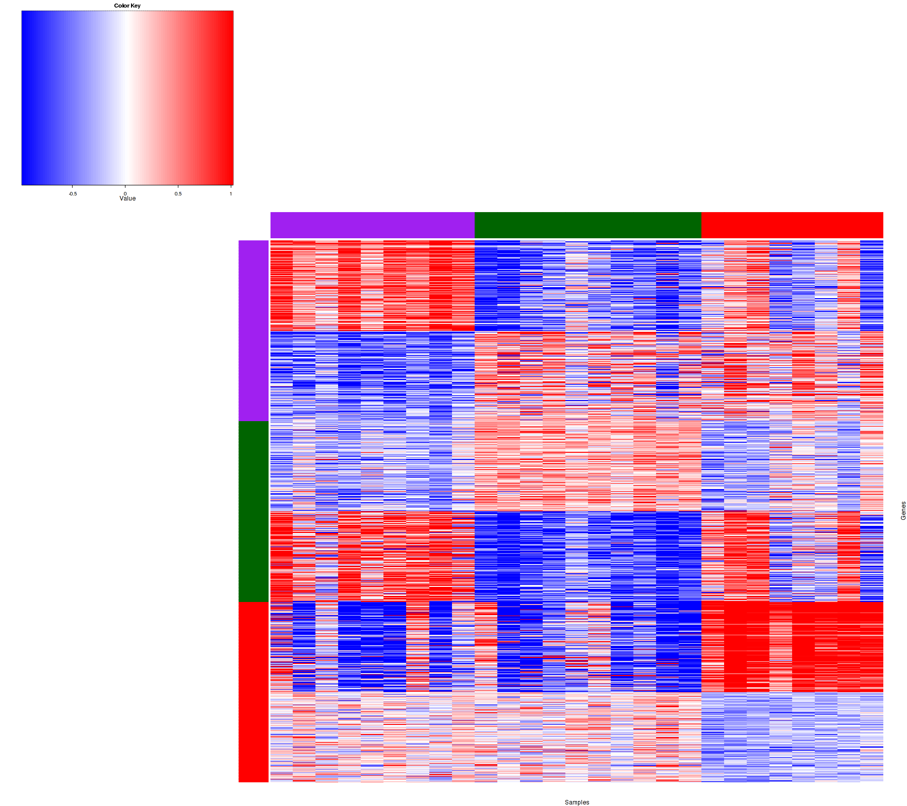 Figure 1. Get High-res Image Samples were separated into 3 clusters. Shown are 27 samples and 900 marker genes. The color bar of the row indicates the marker genes for the corresponding cluster.