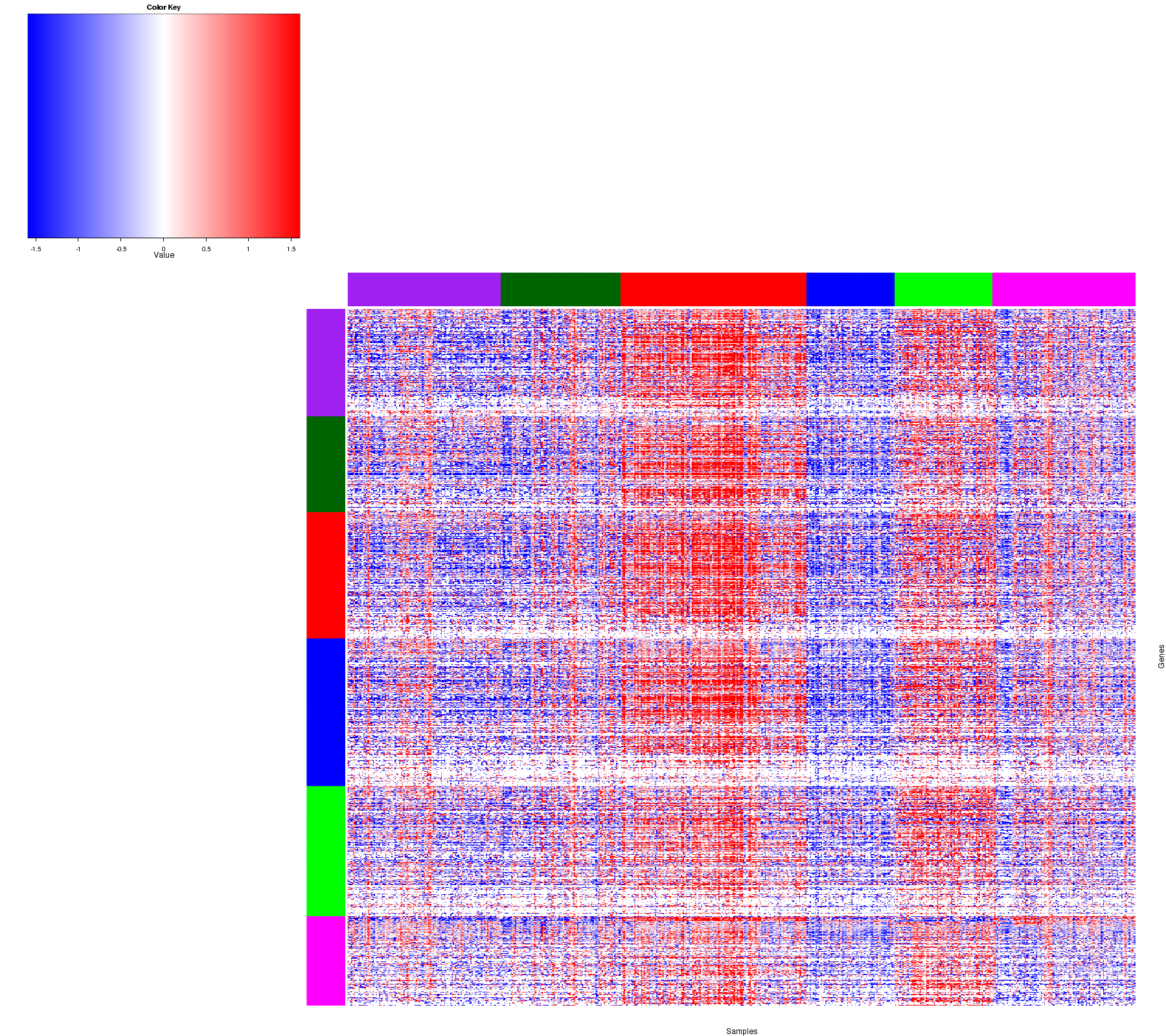 Figure 1. Get High-res Image Samples were separated into 6 clusters. Shown are 508 samples and 2229 marker miRs. The color bar of the row indicates the marker miRs for the corresponding cluster.