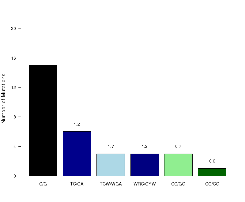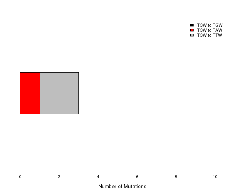Figure 8.  Get High-res Image The number of mutations categorized into three possible types of substitutions at the tCw motif (complementary mutations included) within C- or G-coordinated clusters. Numbers are calculated using the “Totals” row in the corresponding columns of the “*_sorted_sum_G_C_clusters.txt” file. Mutations caused by cytidine deamination in stretches of ssDNA caused by APOBEC mutagenesis are expected to be predominantly C-->T or C-->G with very few C-->A. Base substitution categories are shown within TCW context.