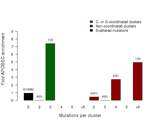 Figure 9.  Get High-res Image Fold enrichment of the APOBEC mutation signature in clusters of different sizes of two categories – C- or G-coordinated or non-coordinated as well as in non-clustered (scattered) mutations. Smaller clusters usually show less enrichment because they have a higher chance to be formed by random mutations that occurred in close vicinity to each other. Values above the bars display the total number of mutation clusters in each class and in parentheses the total numbers of APOBEC signature mutations in a category. Values for fold enrichment as well as mutation and mutation cluster counts are taken from the following output files which can be downloaded from firehose_get (https://confluence.broadinstitute.org/display/GDAC/Download):