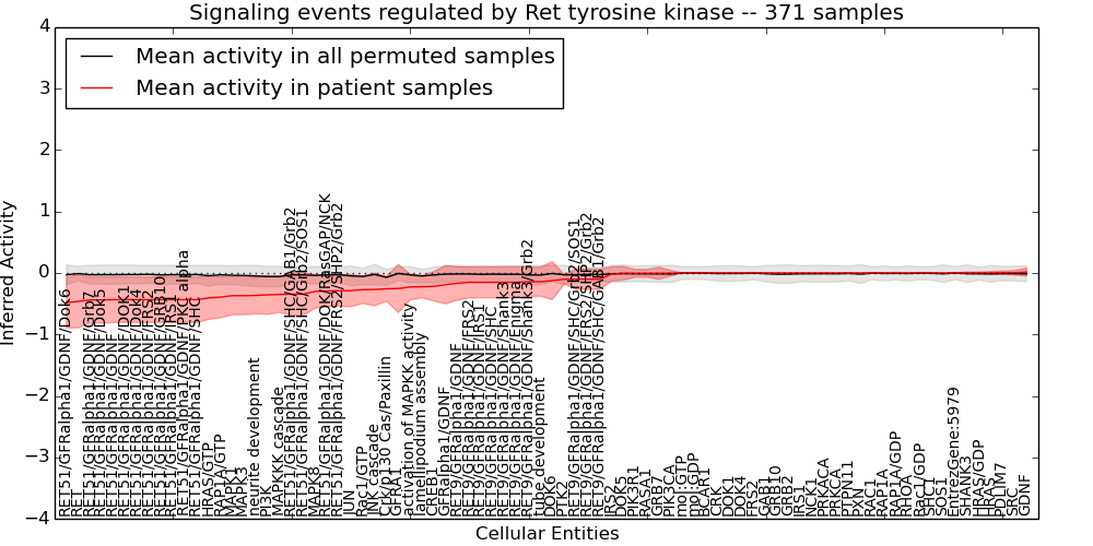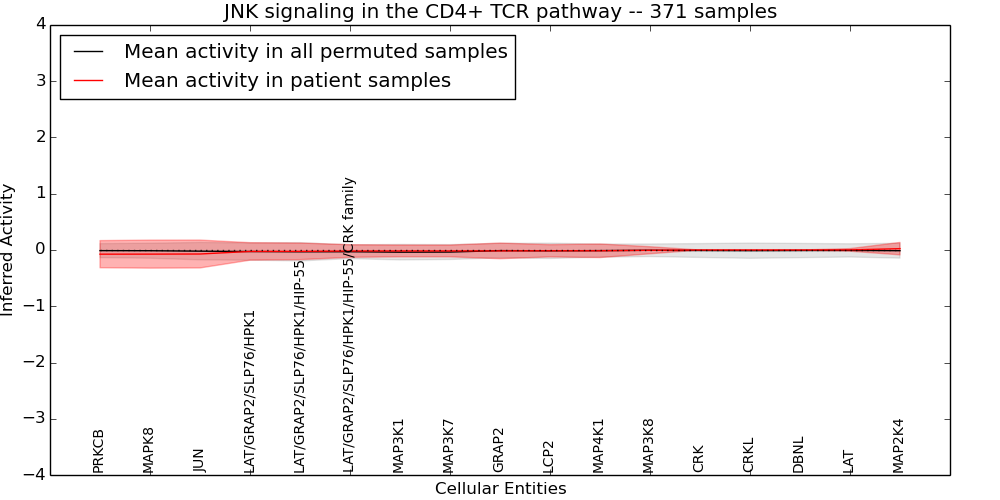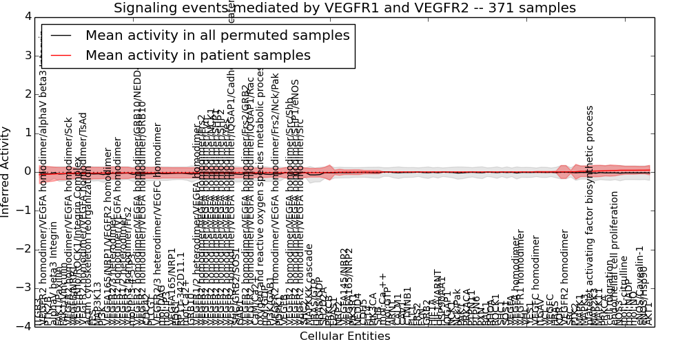 Figure S131.  Get High-res Image This plot shows pathway concept perturbations across all samples against a permutation model. The concepts along the x-axis are sorted by lowest to highest mean activity for the real patient samples. Mean inferred activities are plotted along the y-axis as a colored band showing the average level and one standard deviation range. Real samples are shown in red and permuted samples in black.