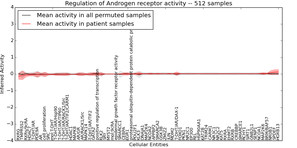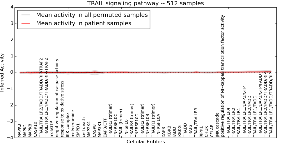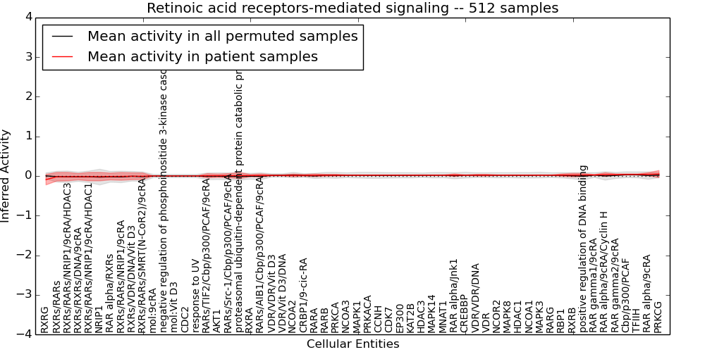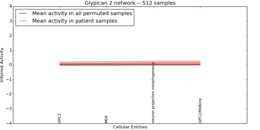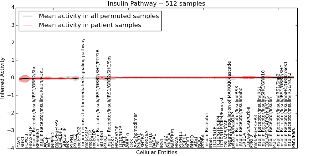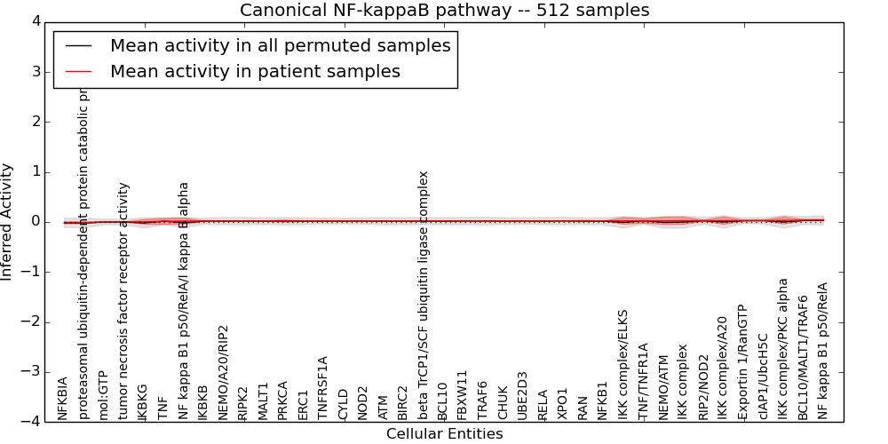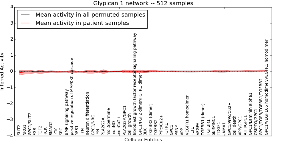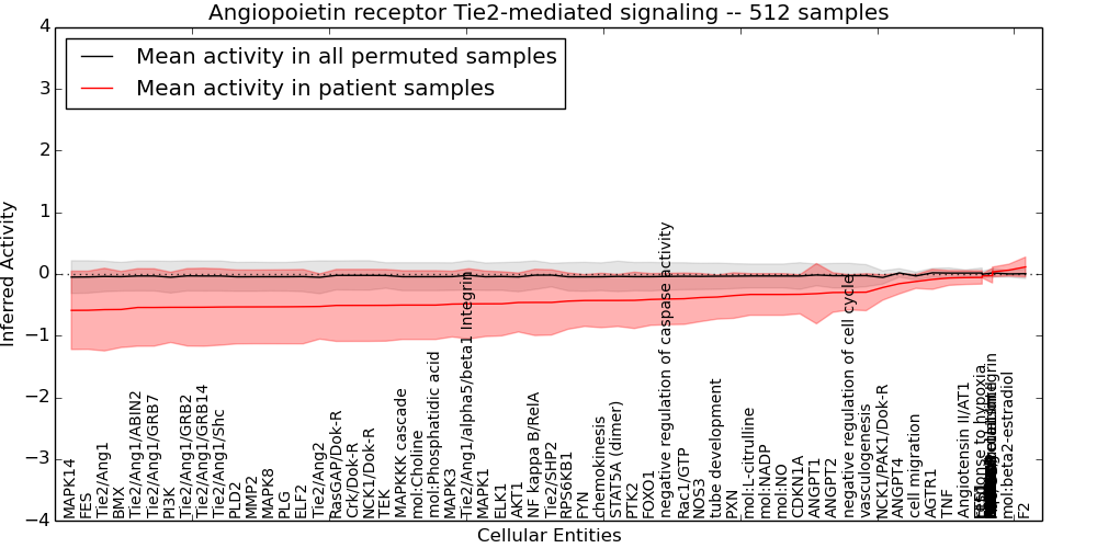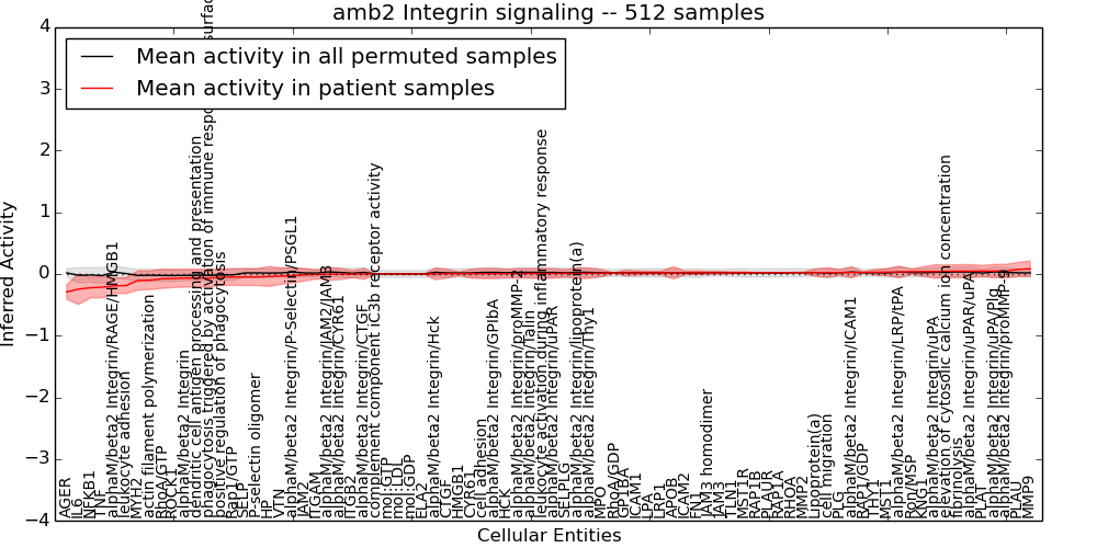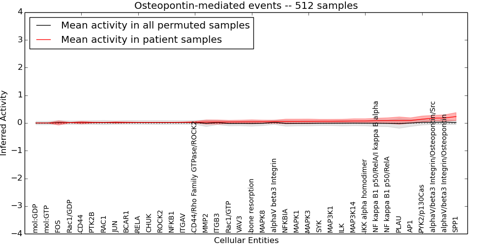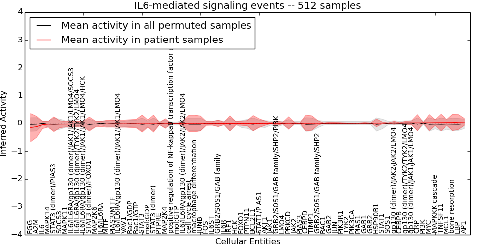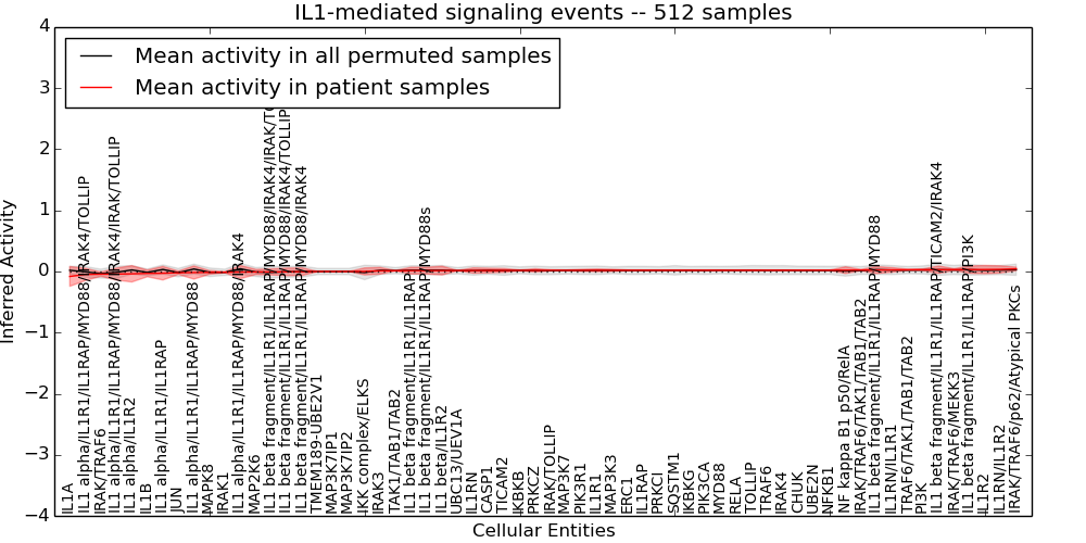 Figure S128. Get High-res Image This plot shows pathway concept perturbations across all samples against a permutation model. The concepts along the x-axis are sorted by lowest to highest mean activity for the real patient samples. Mean inferred activities are plotted along the y-axis as a colored band showing the average level and one standard deviation range. Real samples are shown in red and permuted samples in black.