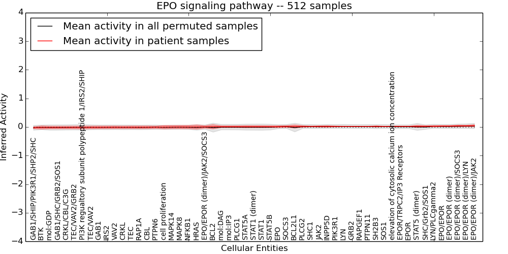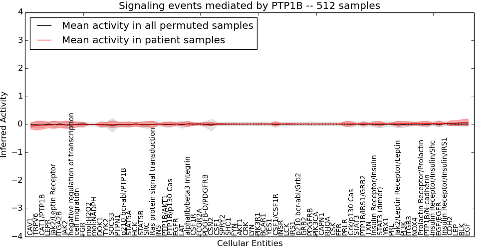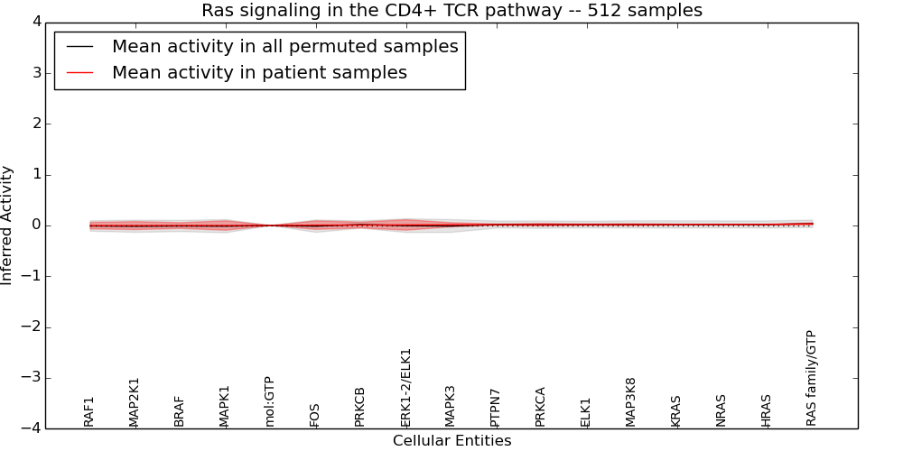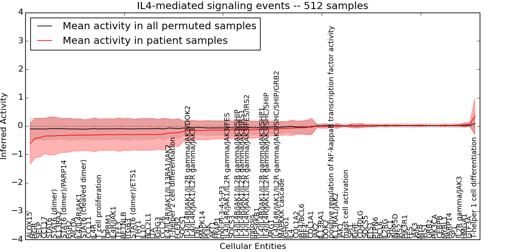 Figure S127. Get High-res Image This plot shows pathway concept perturbations across all samples against a permutation model. The concepts along the x-axis are sorted by lowest to highest mean activity for the real patient samples. Mean inferred activities are plotted along the y-axis as a colored band showing the average level and one standard deviation range. Real samples are shown in red and permuted samples in black.