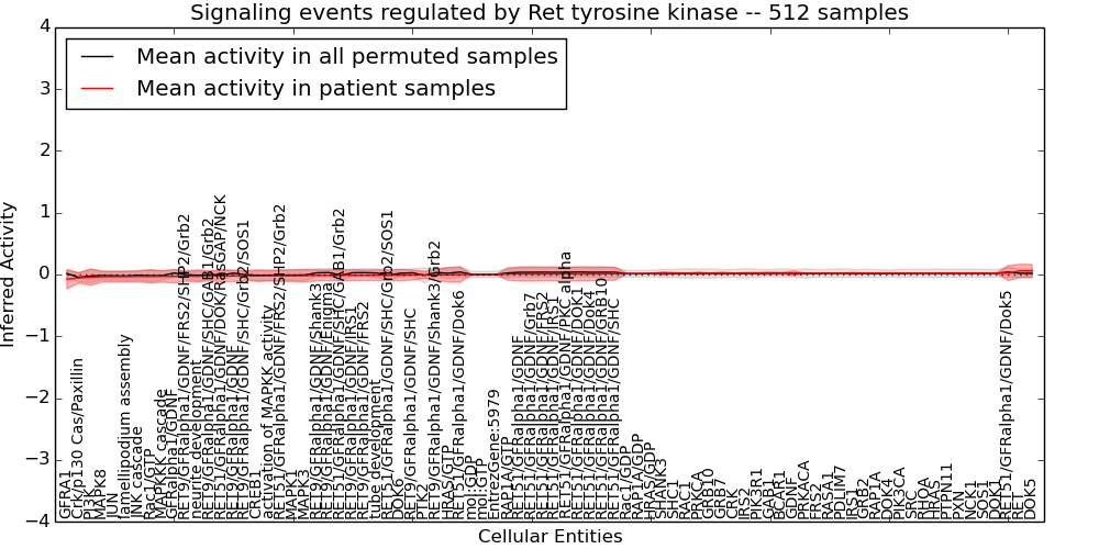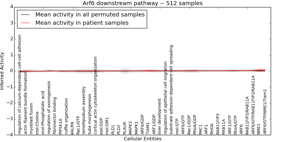 Figure S131. Get High-res Image This plot shows pathway concept perturbations across all samples against a permutation model. The concepts along the x-axis are sorted by lowest to highest mean activity for the real patient samples. Mean inferred activities are plotted along the y-axis as a colored band showing the average level and one standard deviation range. Real samples are shown in red and permuted samples in black.