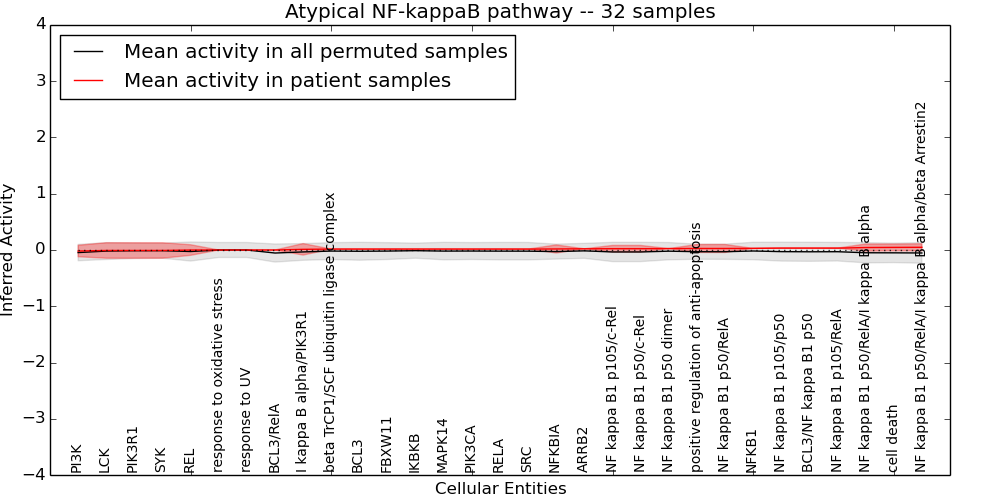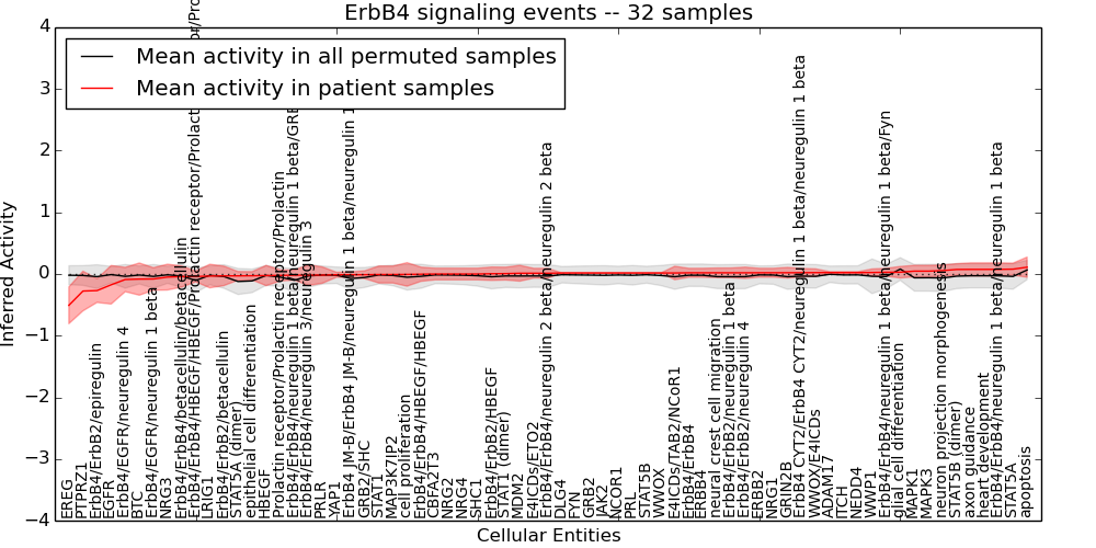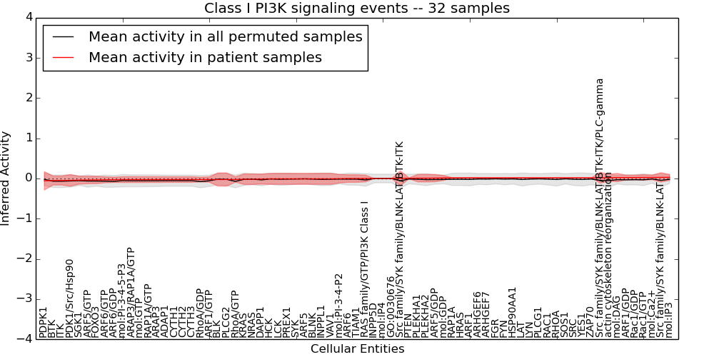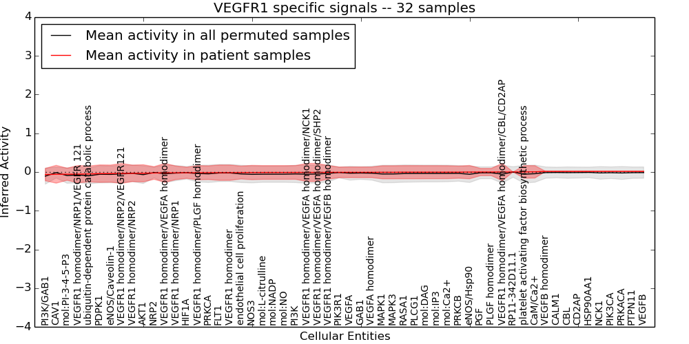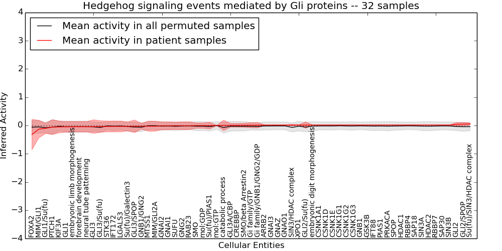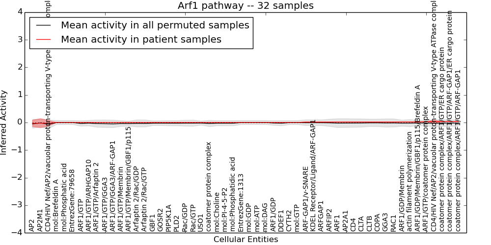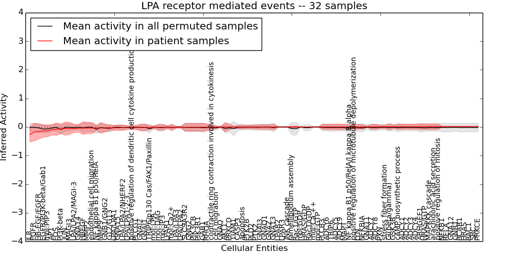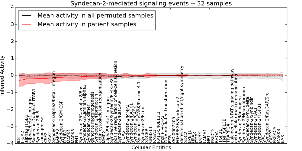 Figure S131. Get High-res Image This plot shows pathway concept perturbations across all samples against a permutation model. The concepts along the x-axis are sorted by lowest to highest mean activity for the real patient samples. Mean inferred activities are plotted along the y-axis as a colored band showing the average level and one standard deviation range. Real samples are shown in red and permuted samples in black.