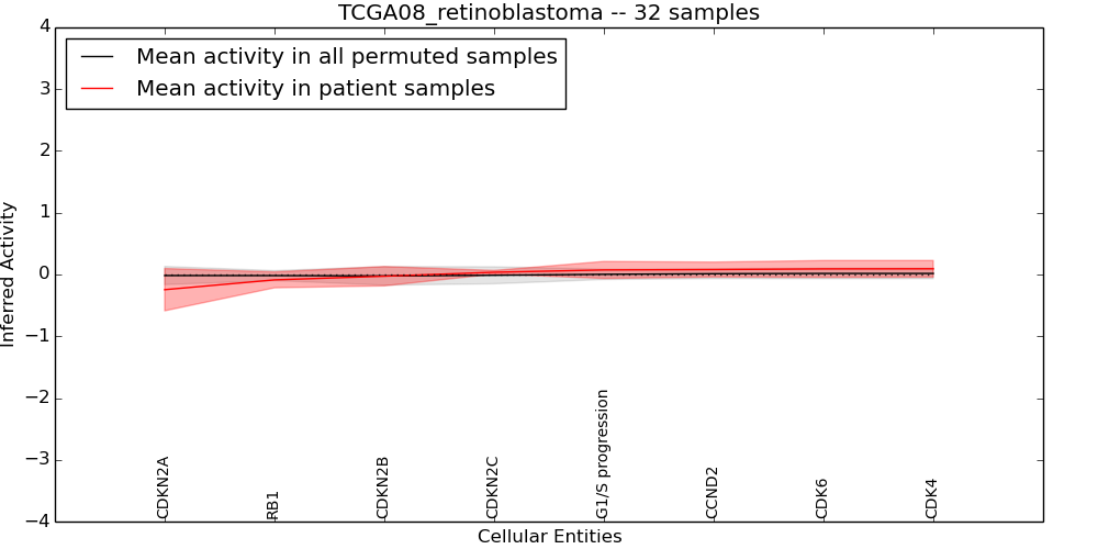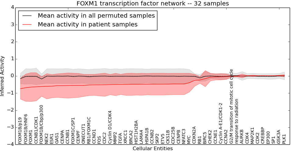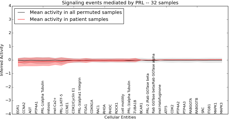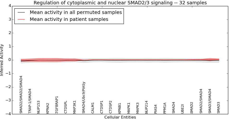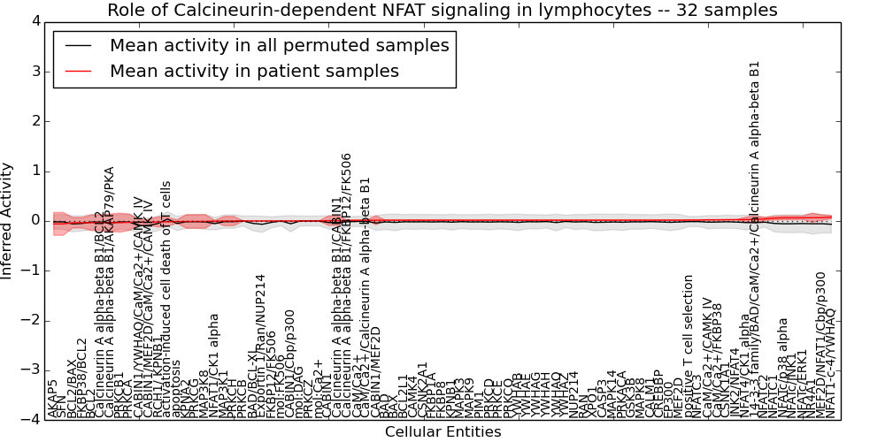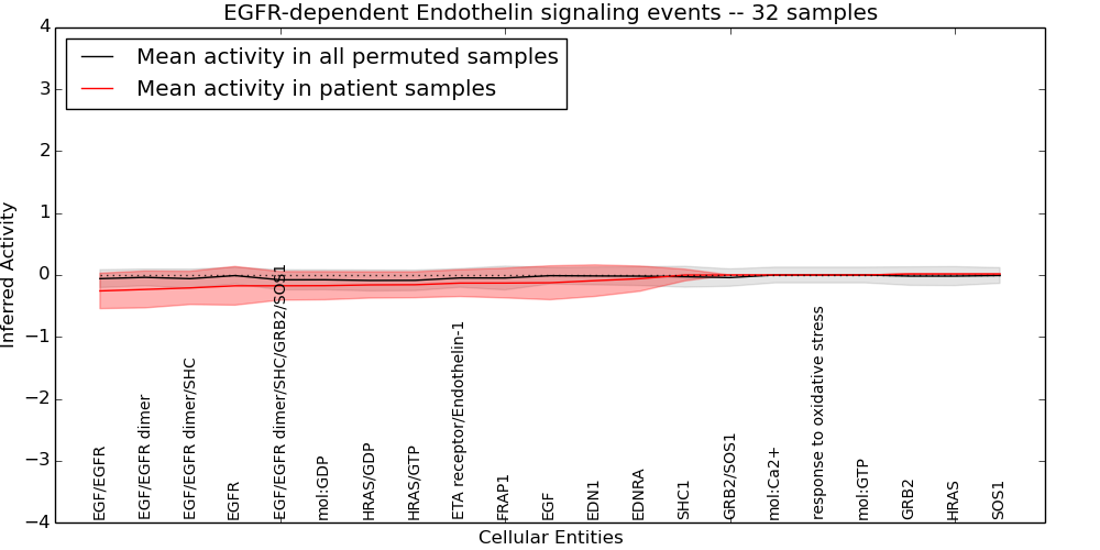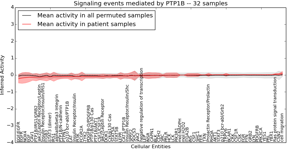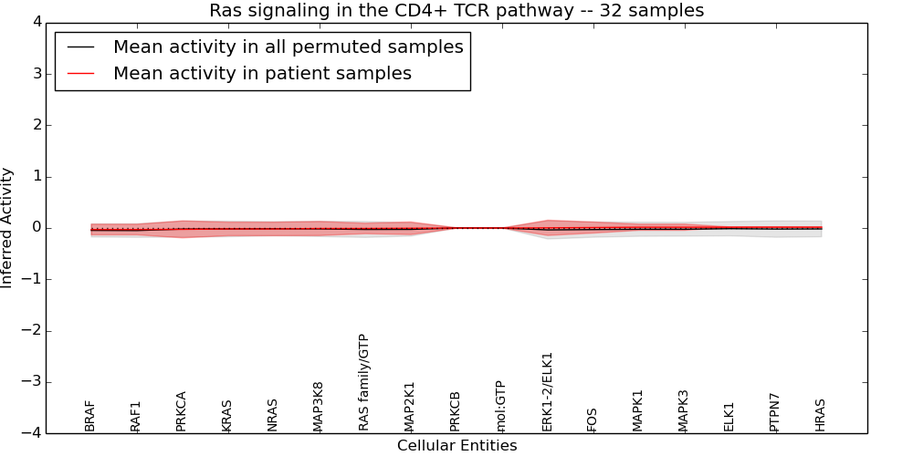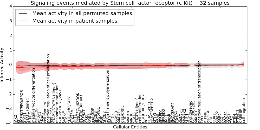 Figure S131. Get High-res Image This plot shows pathway concept perturbations across all samples against a permutation model. The concepts along the x-axis are sorted by lowest to highest mean activity for the real patient samples. Mean inferred activities are plotted along the y-axis as a colored band showing the average level and one standard deviation range. Real samples are shown in red and permuted samples in black.