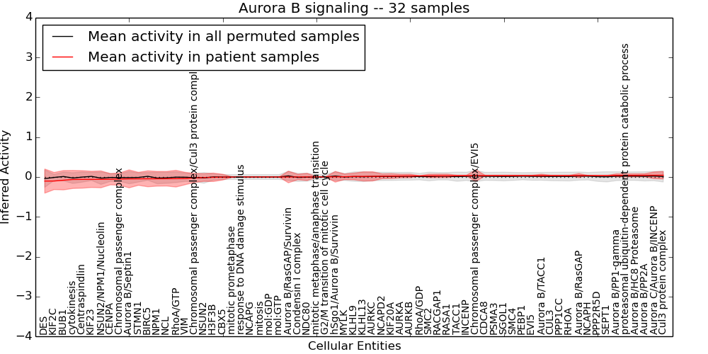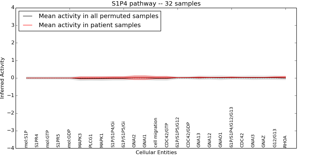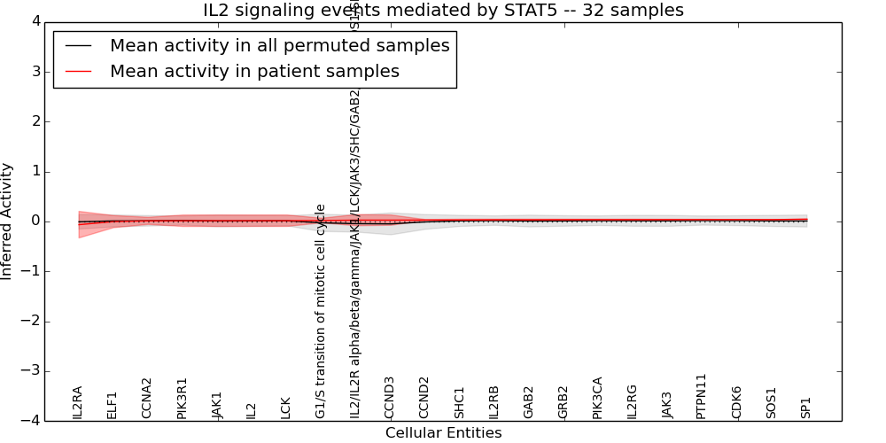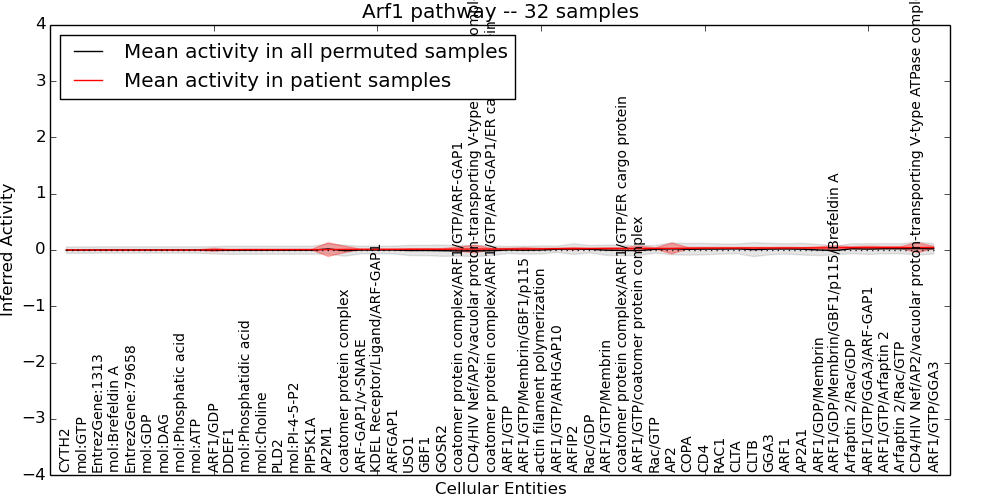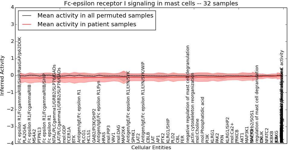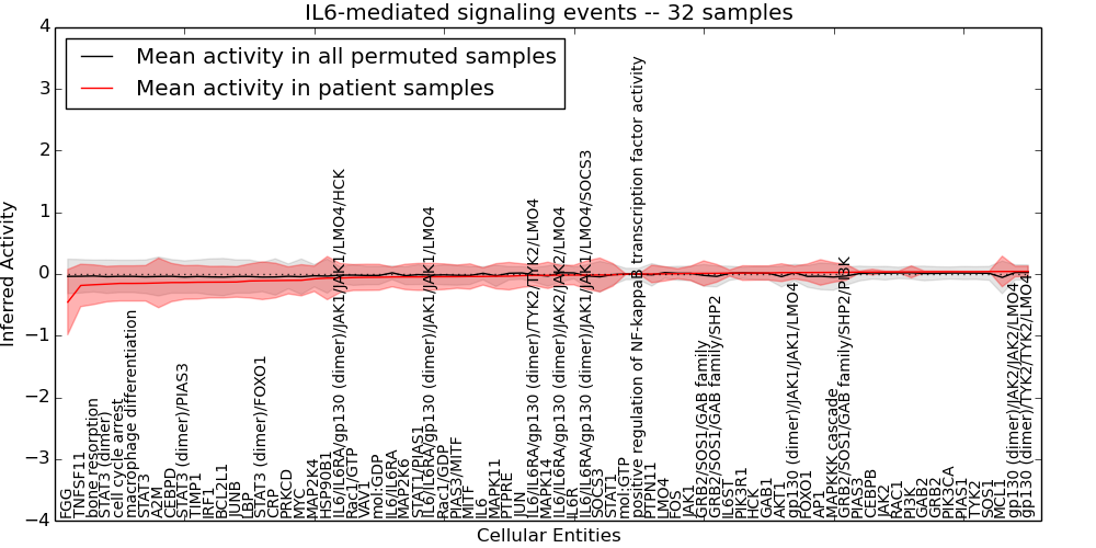 Figure S131. Get High-res Image This plot shows pathway concept perturbations across all samples against a permutation model. The concepts along the x-axis are sorted by lowest to highest mean activity for the real patient samples. Mean inferred activities are plotted along the y-axis as a colored band showing the average level and one standard deviation range. Real samples are shown in red and permuted samples in black.