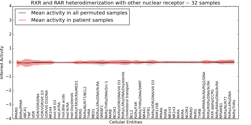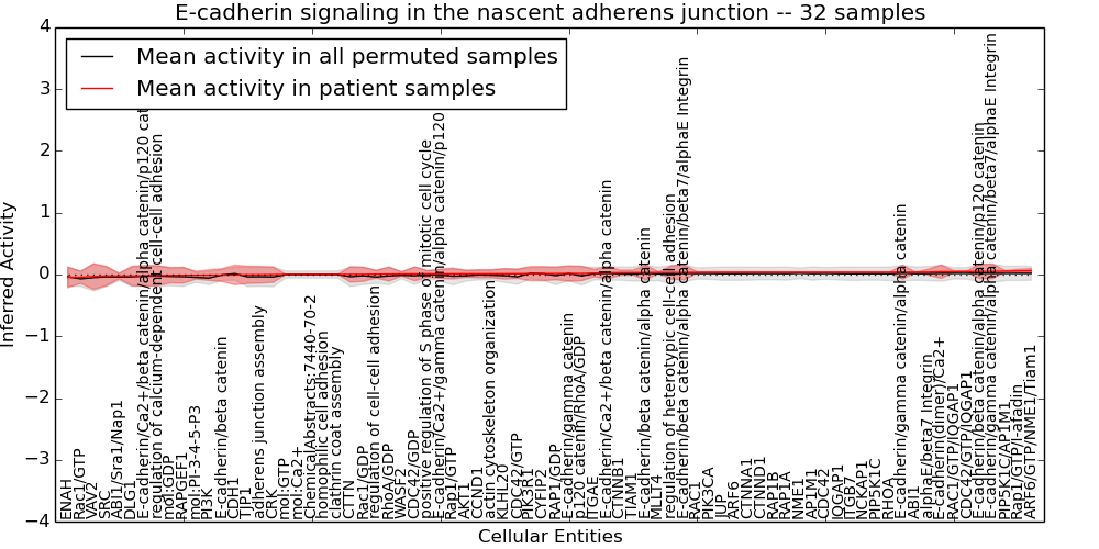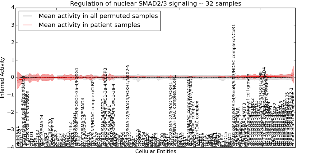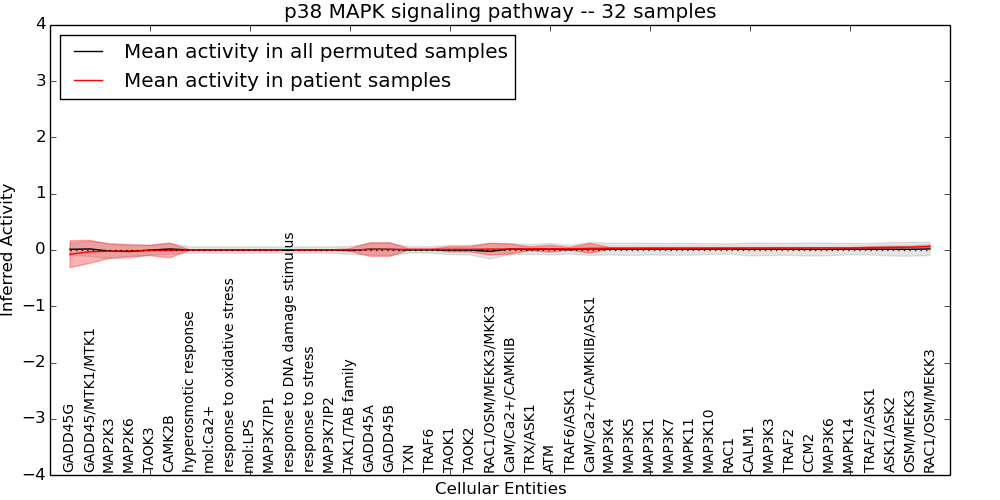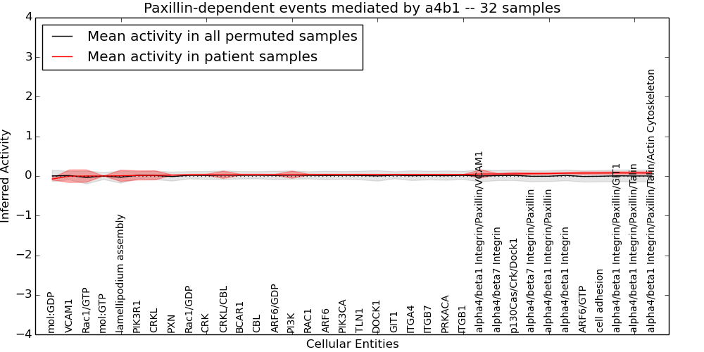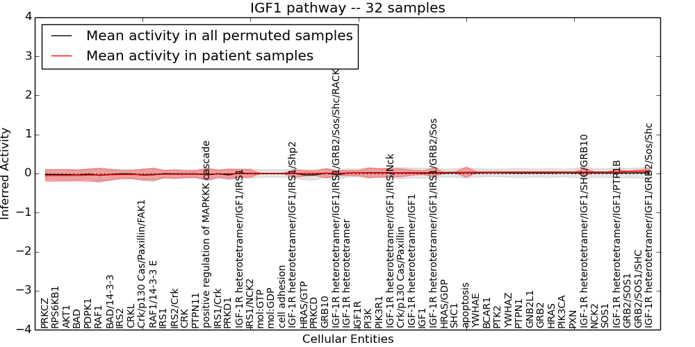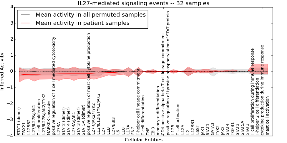 Figure S131. Get High-res Image This plot shows pathway concept perturbations across all samples against a permutation model. The concepts along the x-axis are sorted by lowest to highest mean activity for the real patient samples. Mean inferred activities are plotted along the y-axis as a colored band showing the average level and one standard deviation range. Real samples are shown in red and permuted samples in black.
