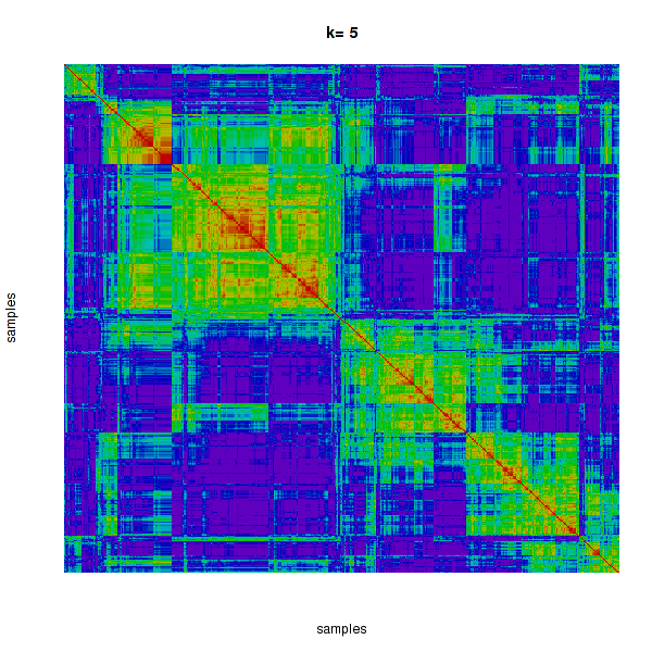 Figure 4. Get High-res Image The consensus matrix after clustering shows 5 clusters with limited overlap between clusters.