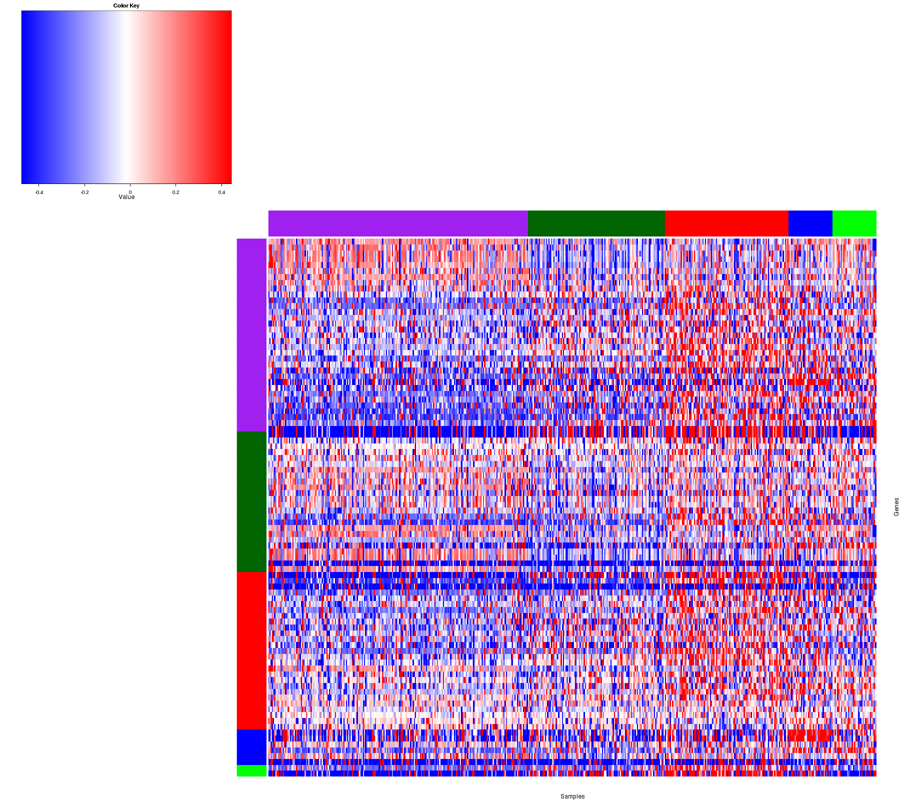 Figure 1. Get High-res Image Samples were separated into 5 clusters. Shown are 501 samples and 92 marker focal events. The color bar of the row indicates the marker focal events for the corresponding cluster.