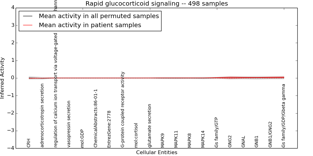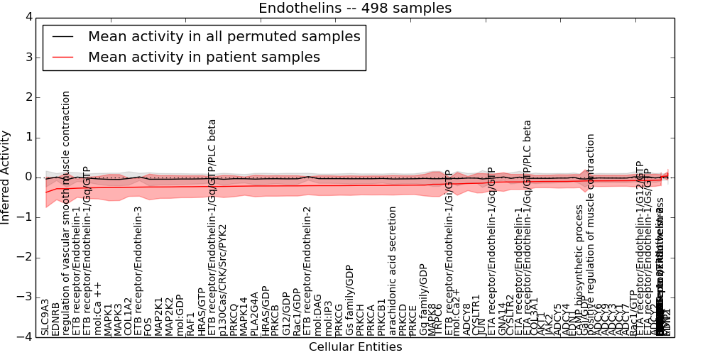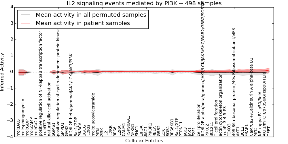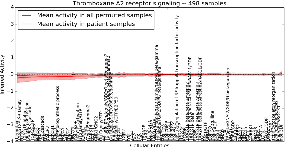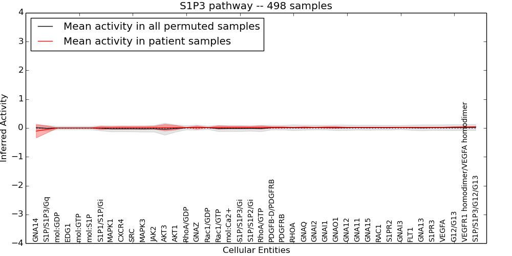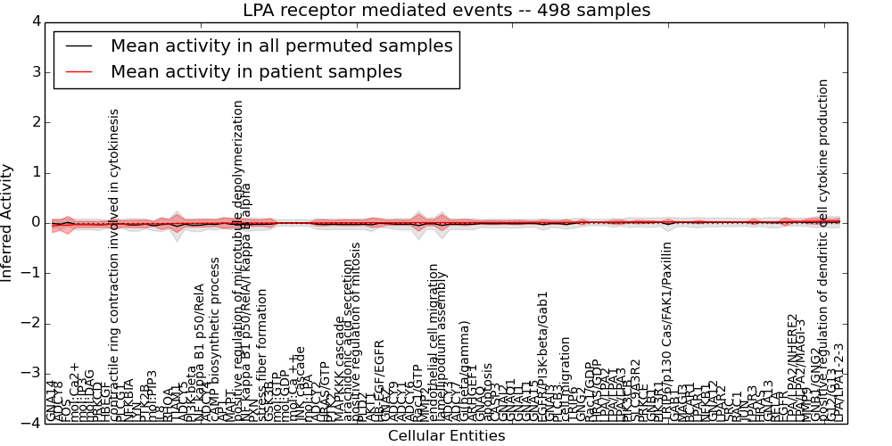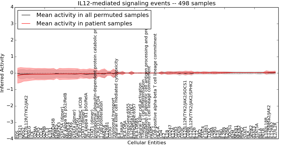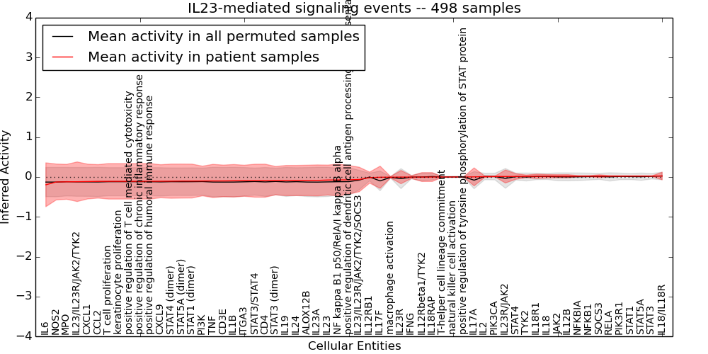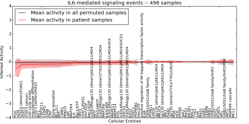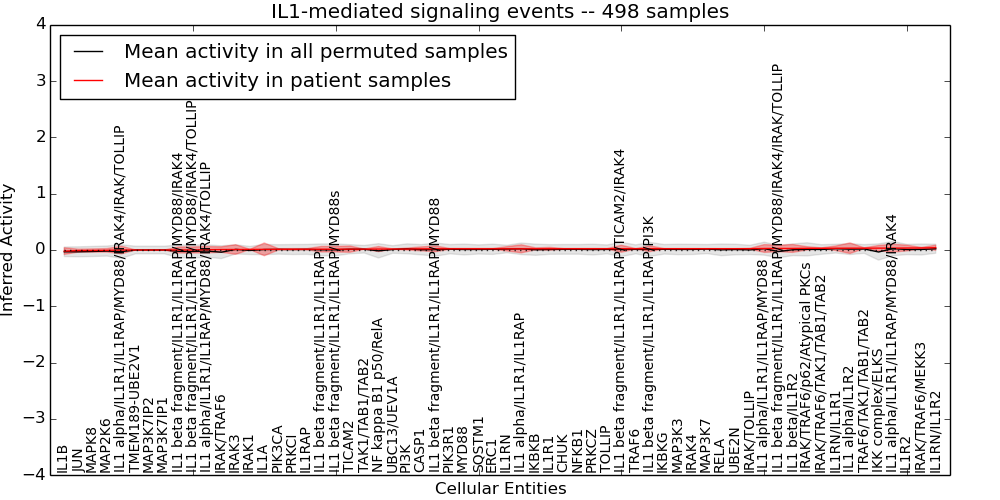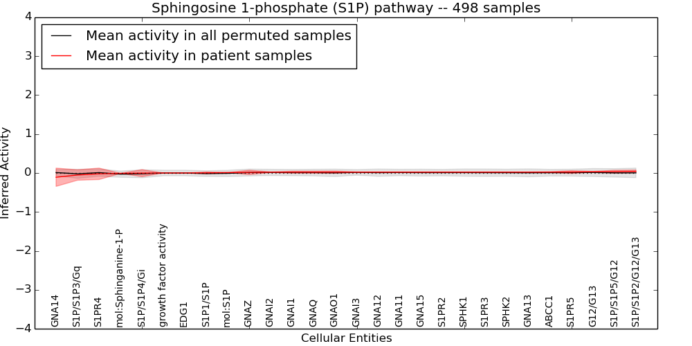 Figure S128. Get High-res Image This plot shows pathway concept perturbations across all samples against a permutation model. The concepts along the x-axis are sorted by lowest to highest mean activity for the real patient samples. Mean inferred activities are plotted along the y-axis as a colored band showing the average level and one standard deviation range. Real samples are shown in red and permuted samples in black.