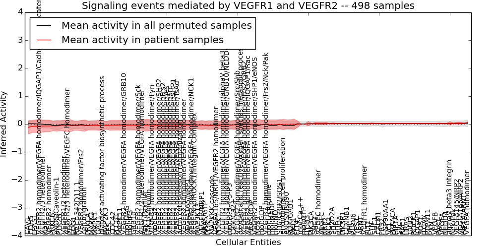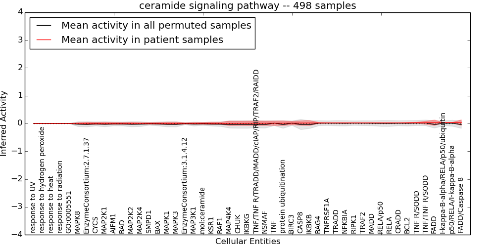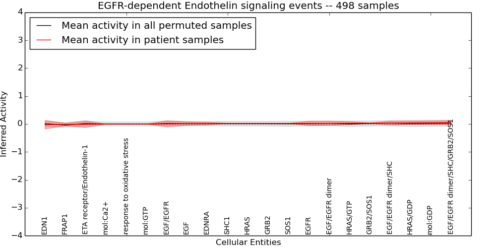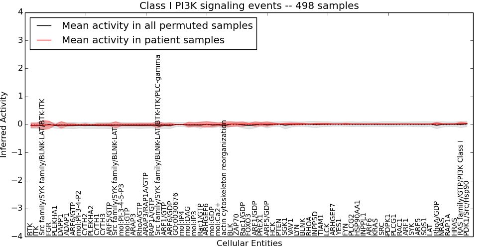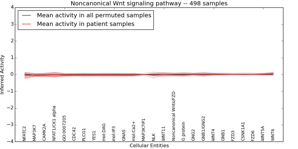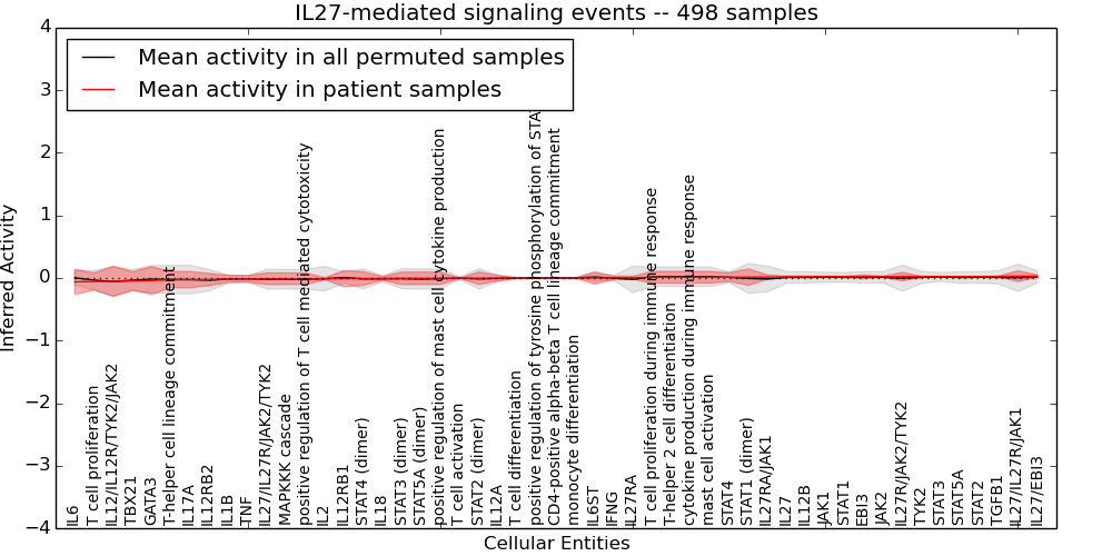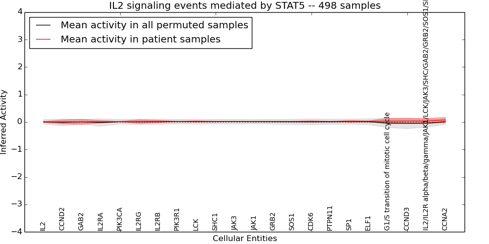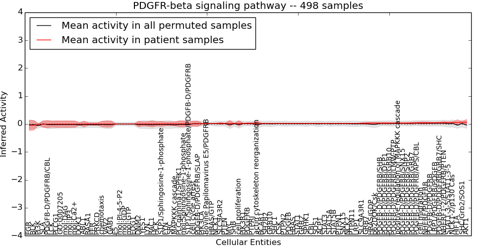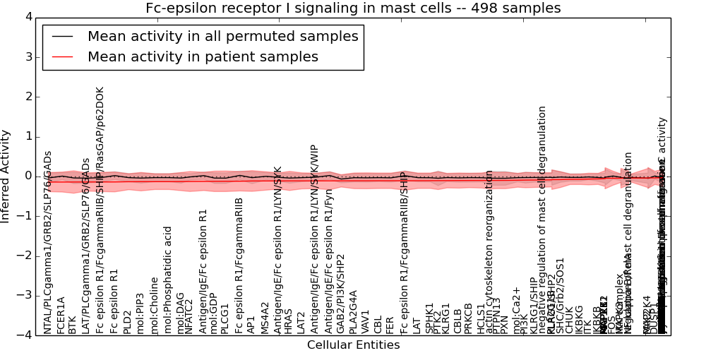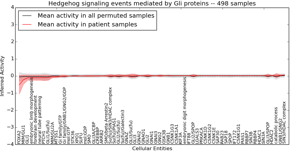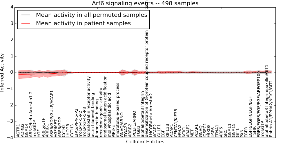 Figure S128. Get High-res Image This plot shows pathway concept perturbations across all samples against a permutation model. The concepts along the x-axis are sorted by lowest to highest mean activity for the real patient samples. Mean inferred activities are plotted along the y-axis as a colored band showing the average level and one standard deviation range. Real samples are shown in red and permuted samples in black.