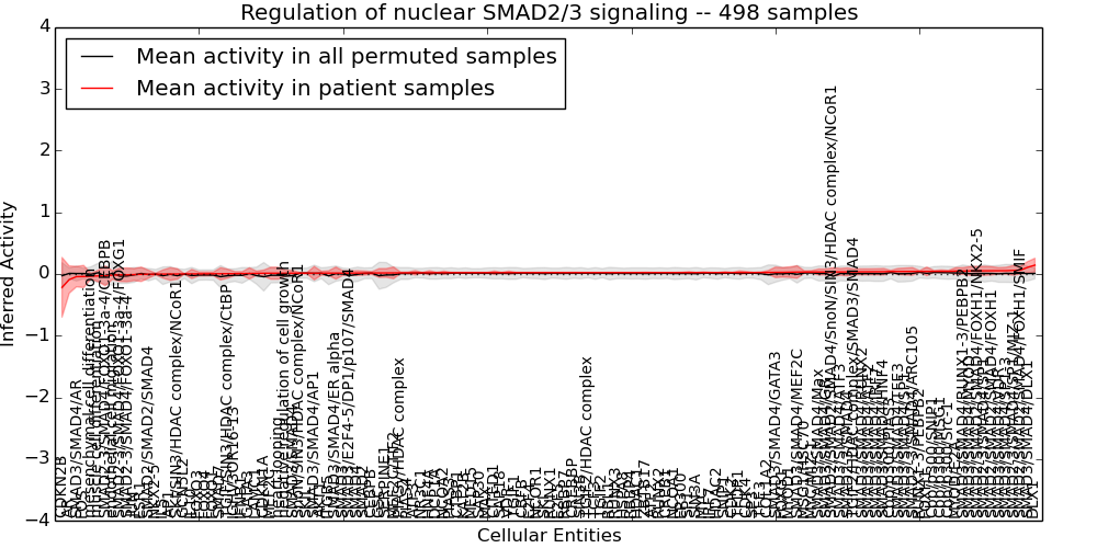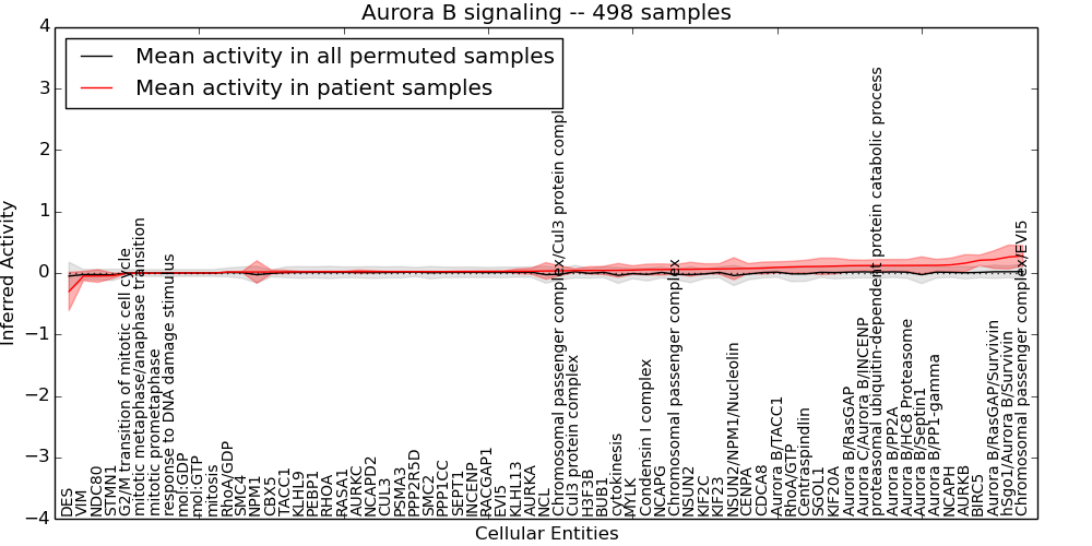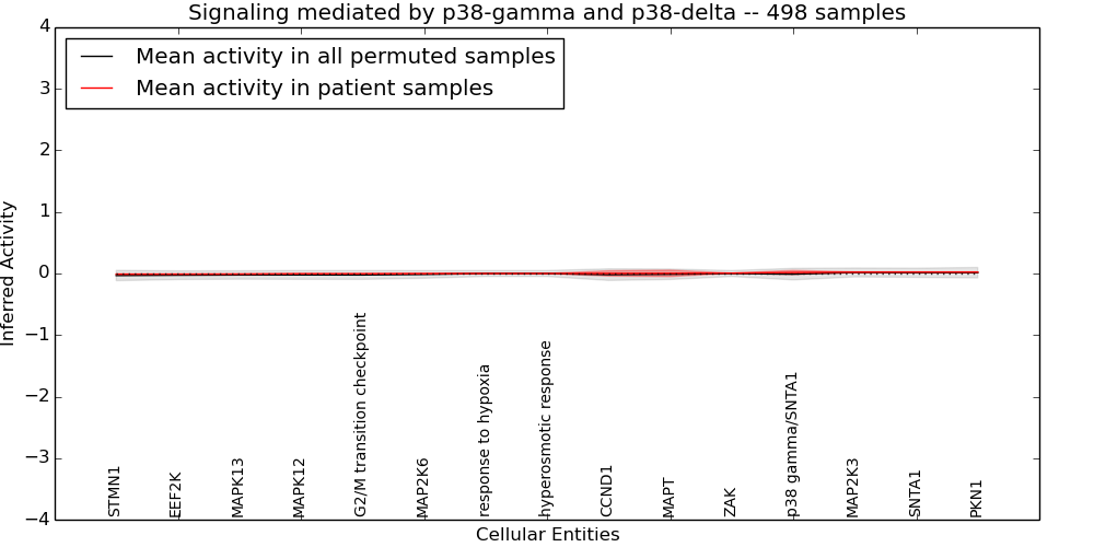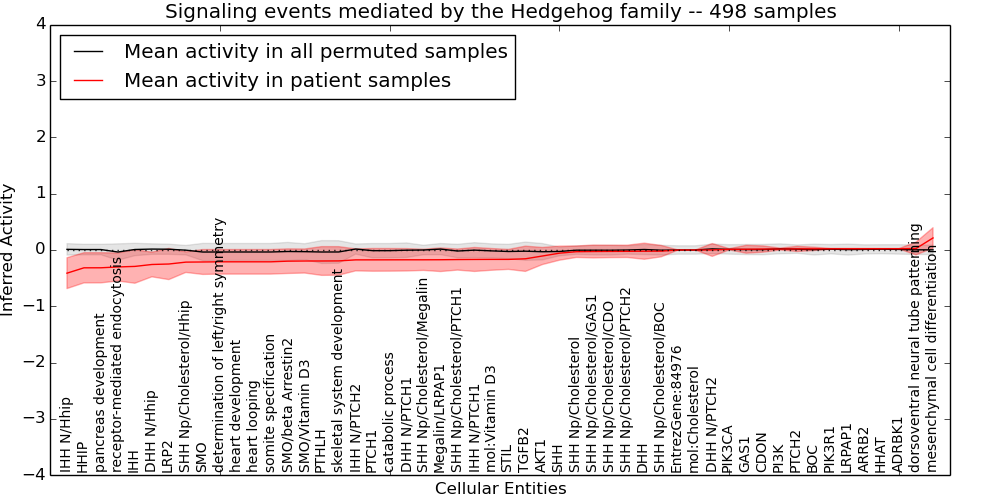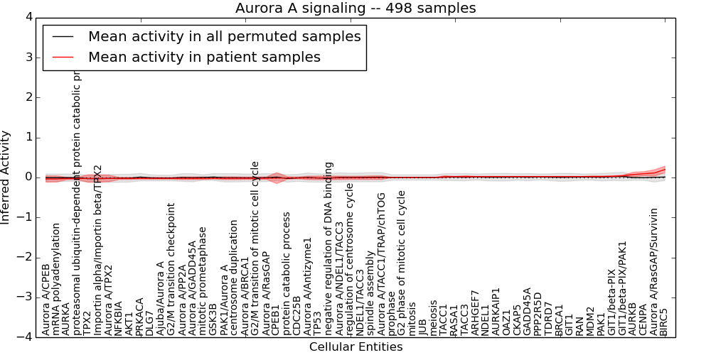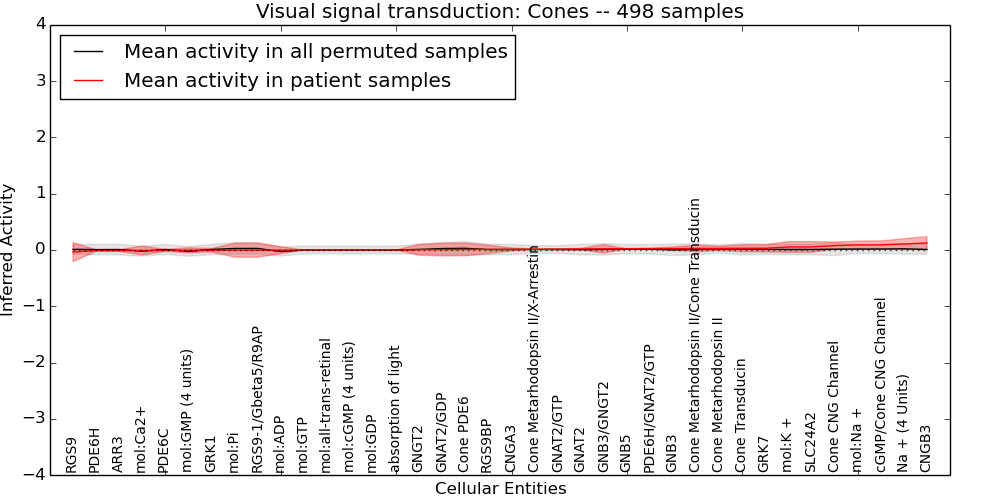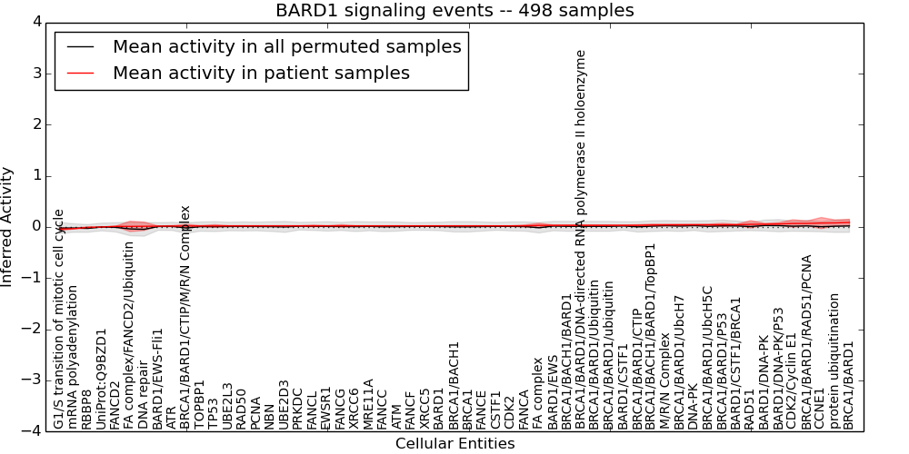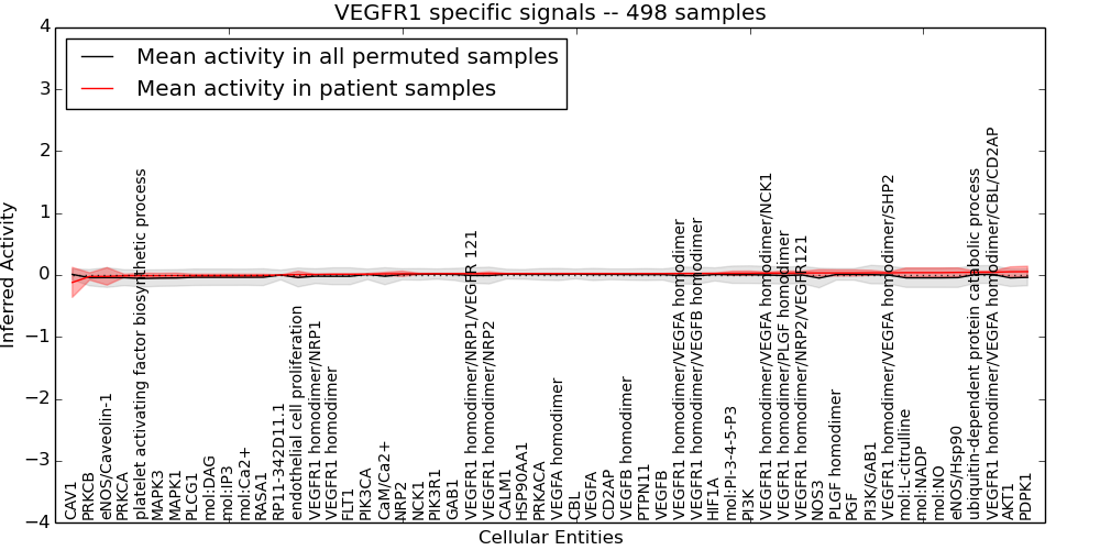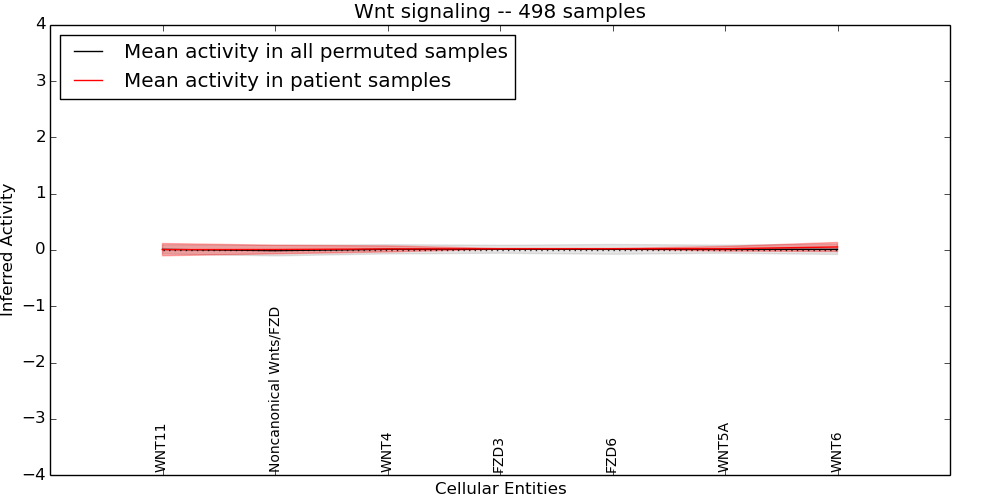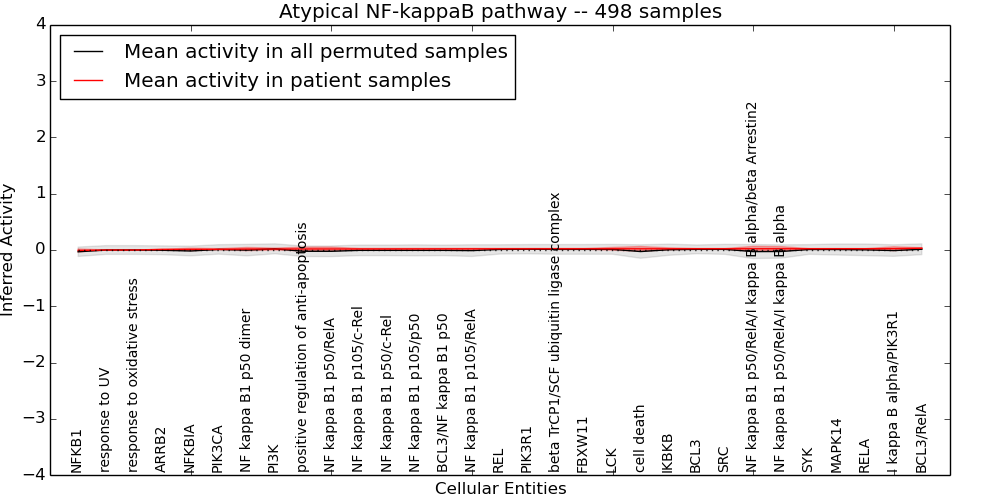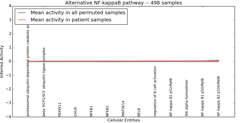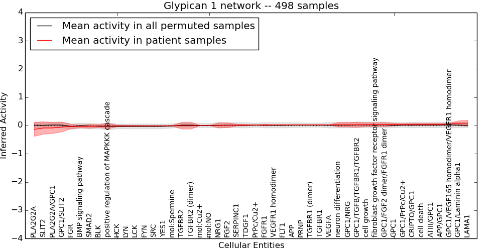 Figure S128. Get High-res Image This plot shows pathway concept perturbations across all samples against a permutation model. The concepts along the x-axis are sorted by lowest to highest mean activity for the real patient samples. Mean inferred activities are plotted along the y-axis as a colored band showing the average level and one standard deviation range. Real samples are shown in red and permuted samples in black.
