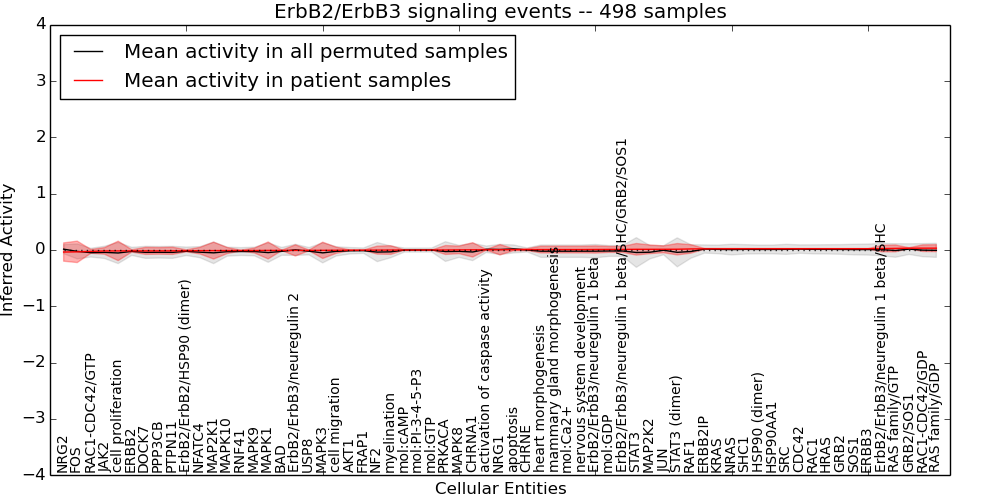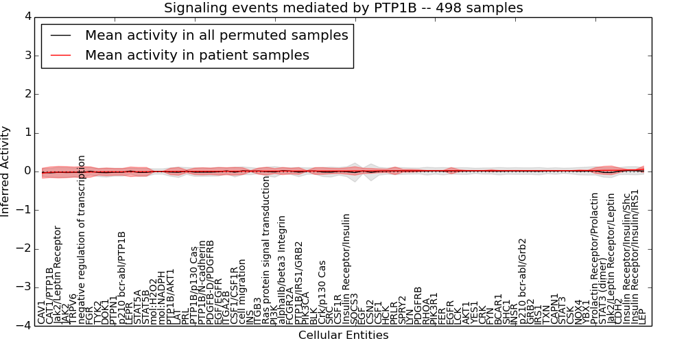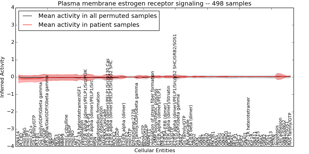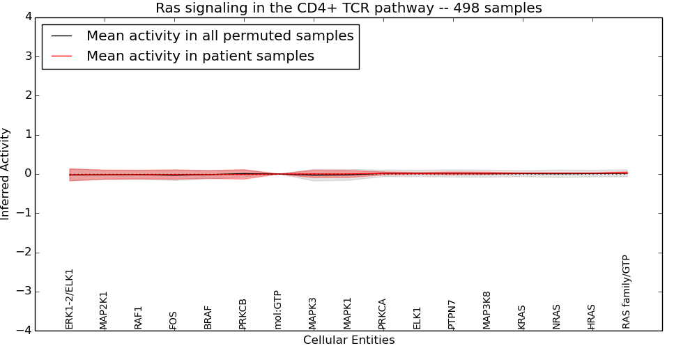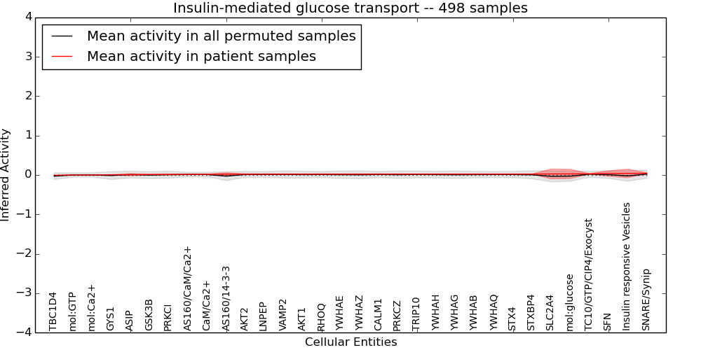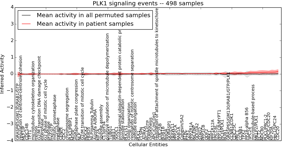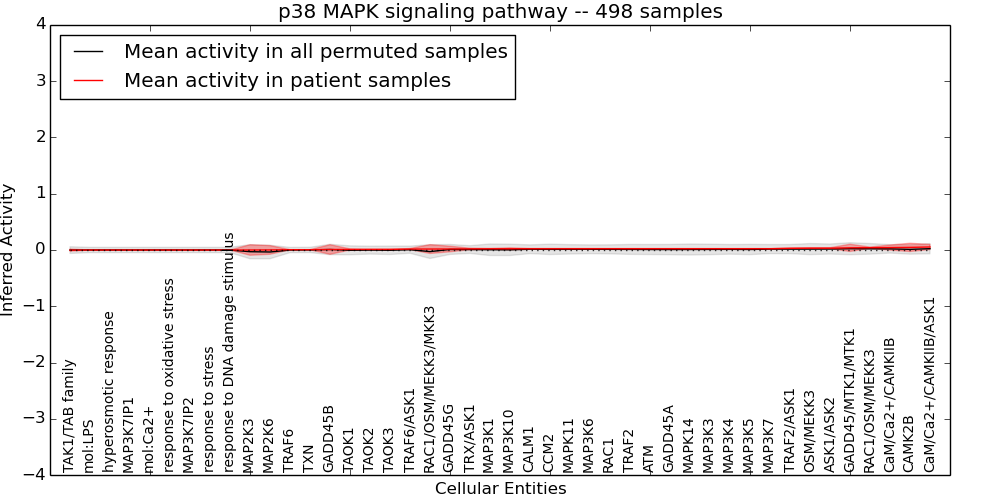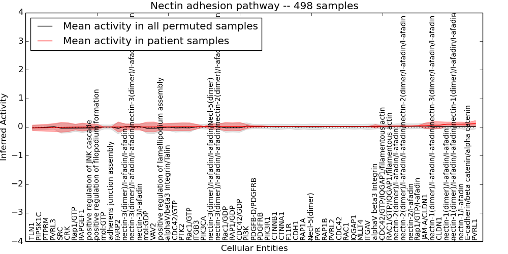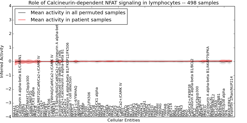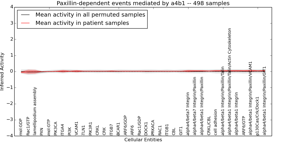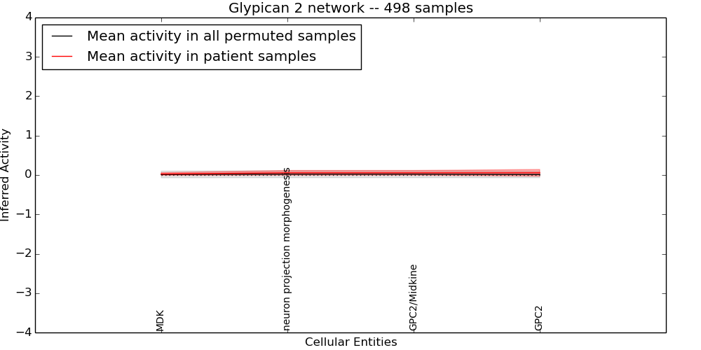 Figure S128. Get High-res Image This plot shows pathway concept perturbations across all samples against a permutation model. The concepts along the x-axis are sorted by lowest to highest mean activity for the real patient samples. Mean inferred activities are plotted along the y-axis as a colored band showing the average level and one standard deviation range. Real samples are shown in red and permuted samples in black.