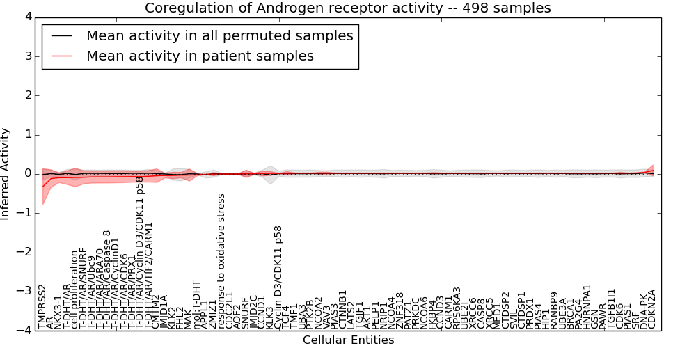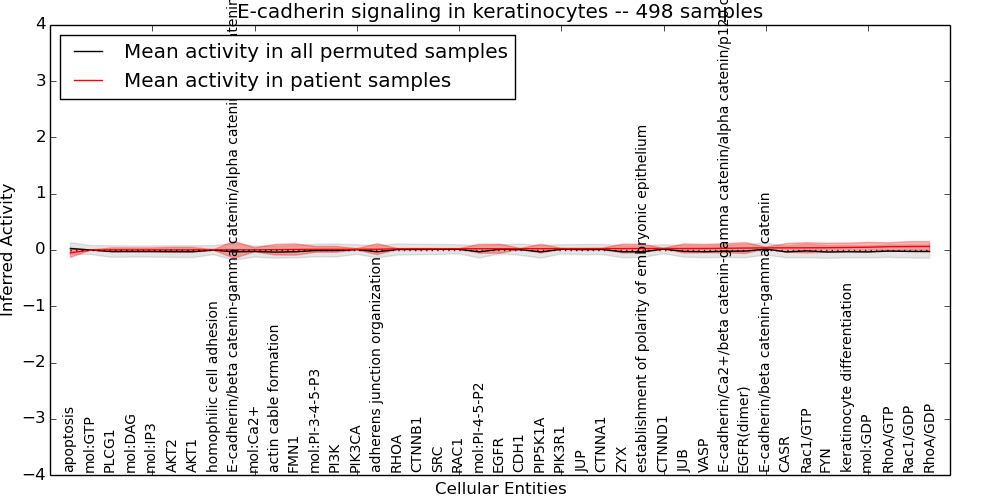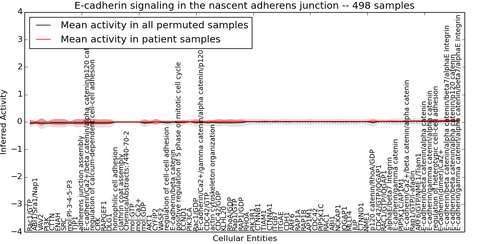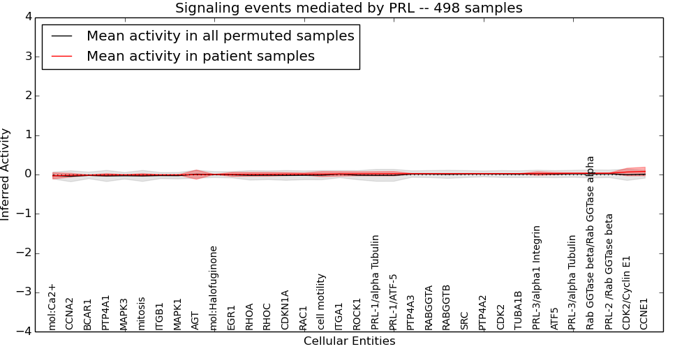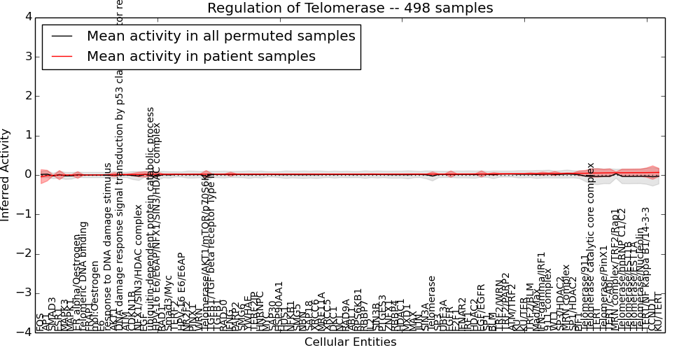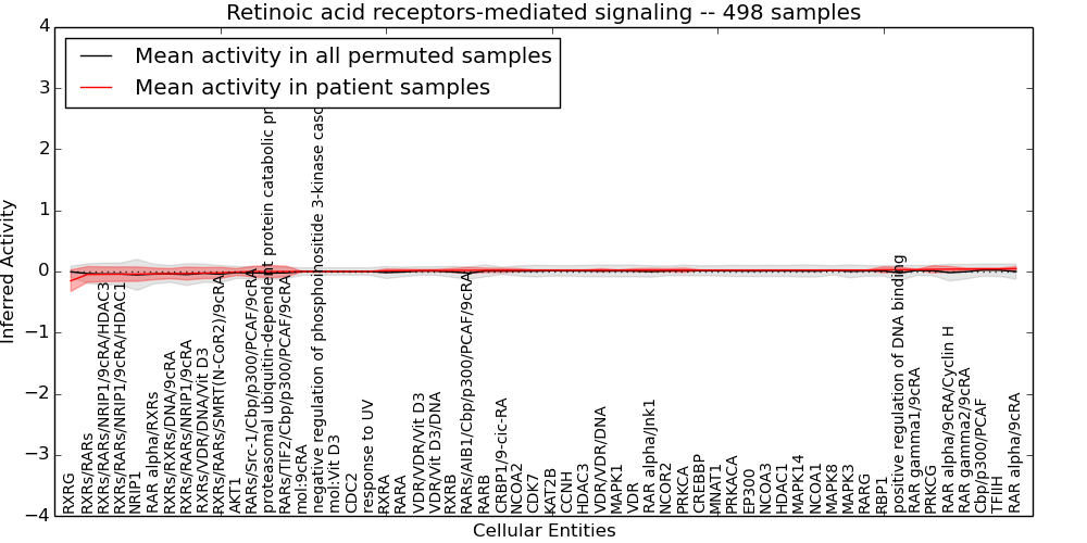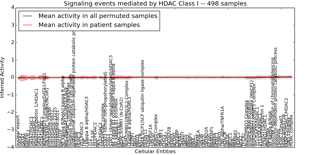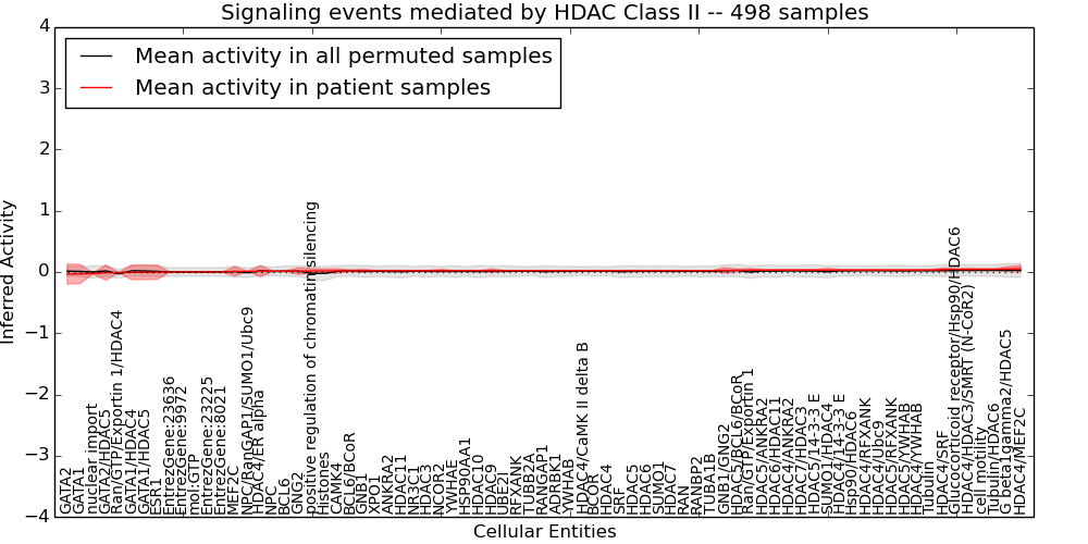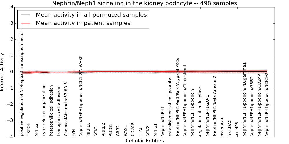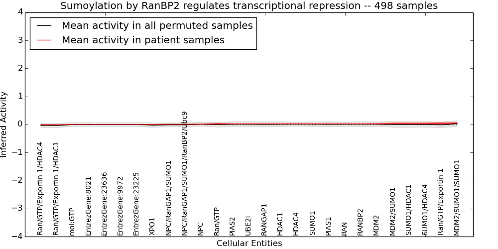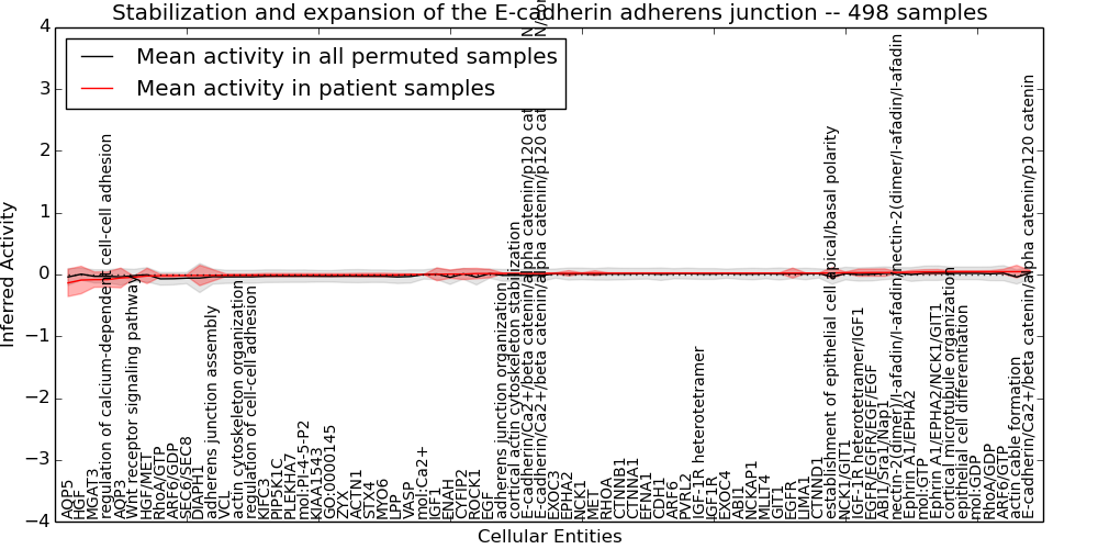 Figure S128. Get High-res Image This plot shows pathway concept perturbations across all samples against a permutation model. The concepts along the x-axis are sorted by lowest to highest mean activity for the real patient samples. Mean inferred activities are plotted along the y-axis as a colored band showing the average level and one standard deviation range. Real samples are shown in red and permuted samples in black.