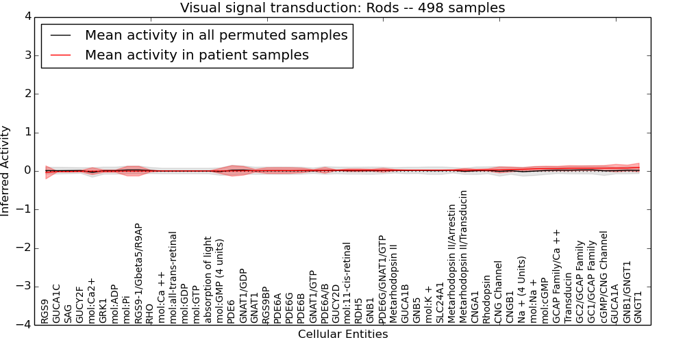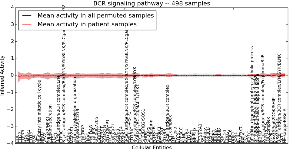 Figure S126. Get High-res Image This plot shows pathway concept perturbations across all samples against a permutation model. The concepts along the x-axis are sorted by lowest to highest mean activity for the real patient samples. Mean inferred activities are plotted along the y-axis as a colored band showing the average level and one standard deviation range. Real samples are shown in red and permuted samples in black.