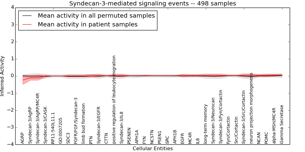 Figure S131. Get High-res Image This plot shows pathway concept perturbations across all samples against a permutation model. The concepts along the x-axis are sorted by lowest to highest mean activity for the real patient samples. Mean inferred activities are plotted along the y-axis as a colored band showing the average level and one standard deviation range. Real samples are shown in red and permuted samples in black.