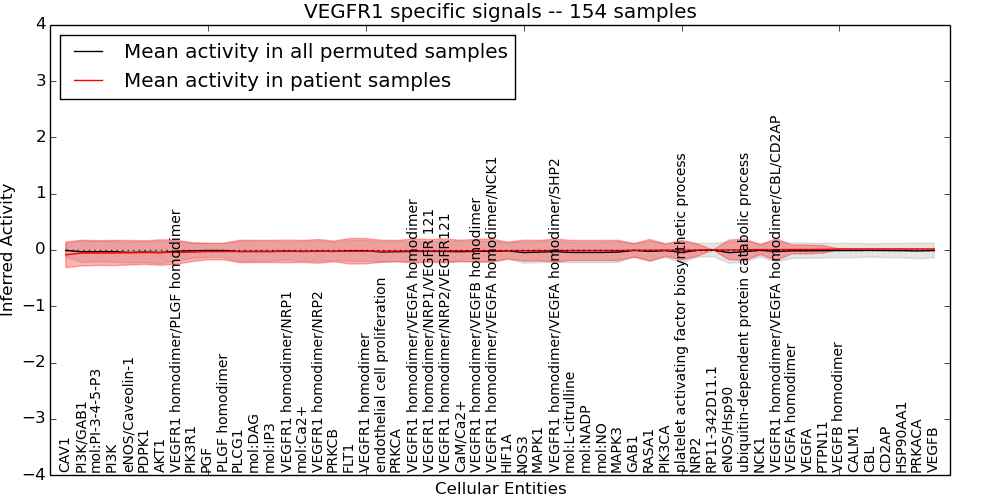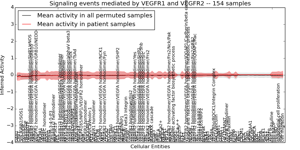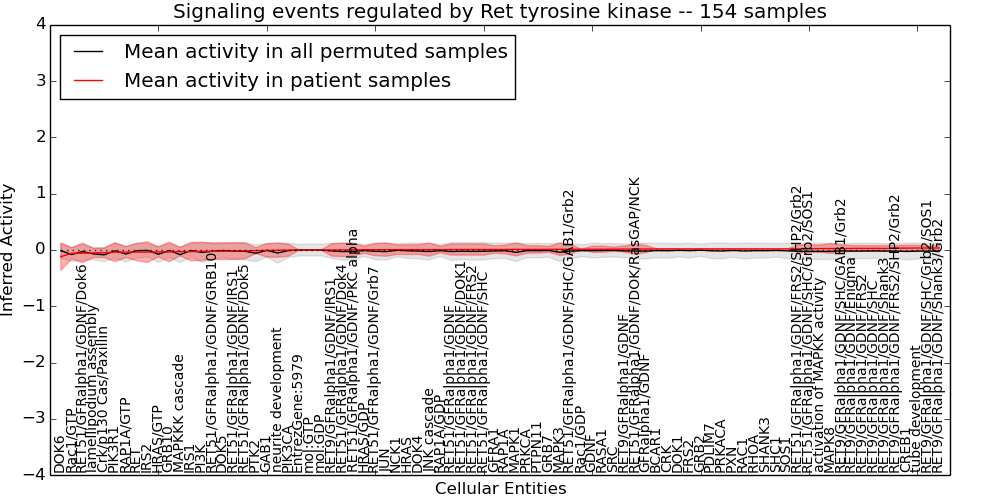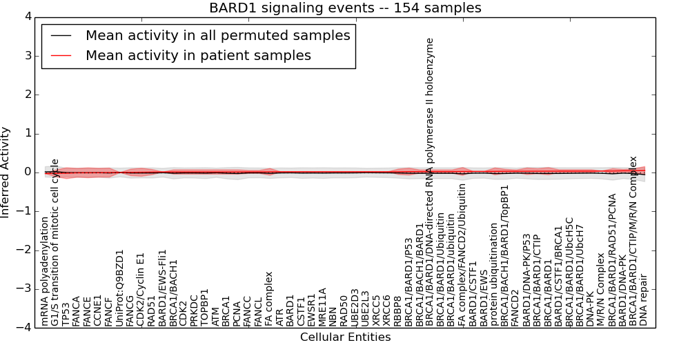 Figure S131.  Get High-res Image This plot shows pathway concept perturbations across all samples against a permutation model. The concepts along the x-axis are sorted by lowest to highest mean activity for the real patient samples. Mean inferred activities are plotted along the y-axis as a colored band showing the average level and one standard deviation range. Real samples are shown in red and permuted samples in black.