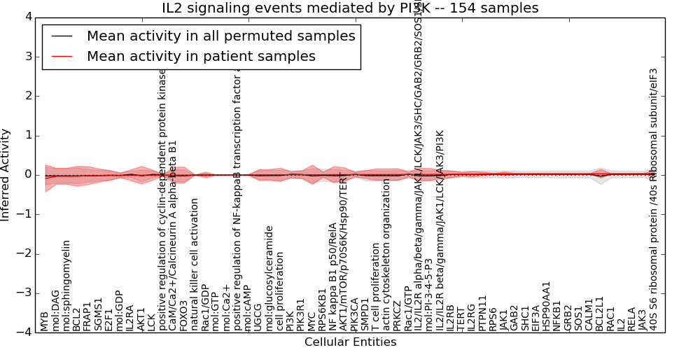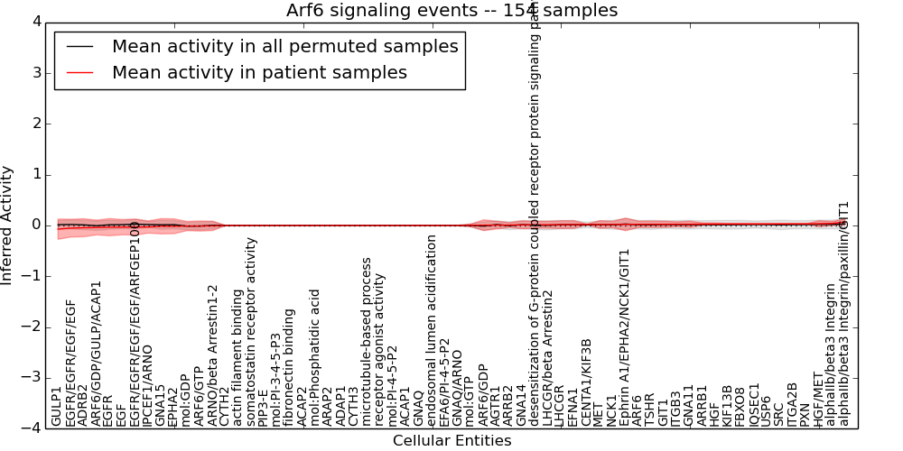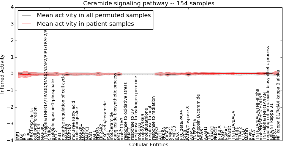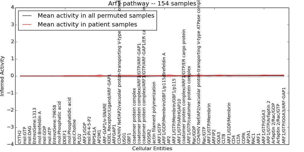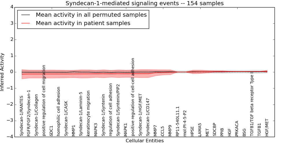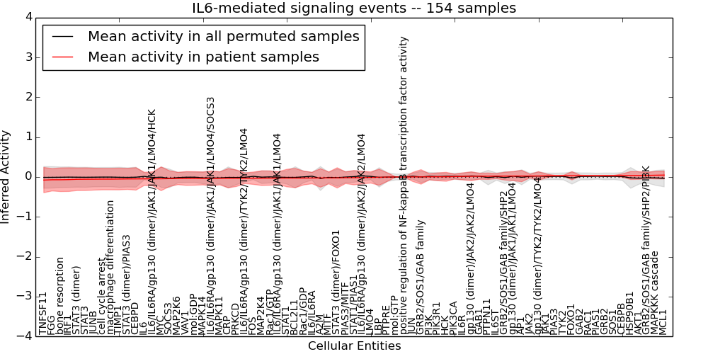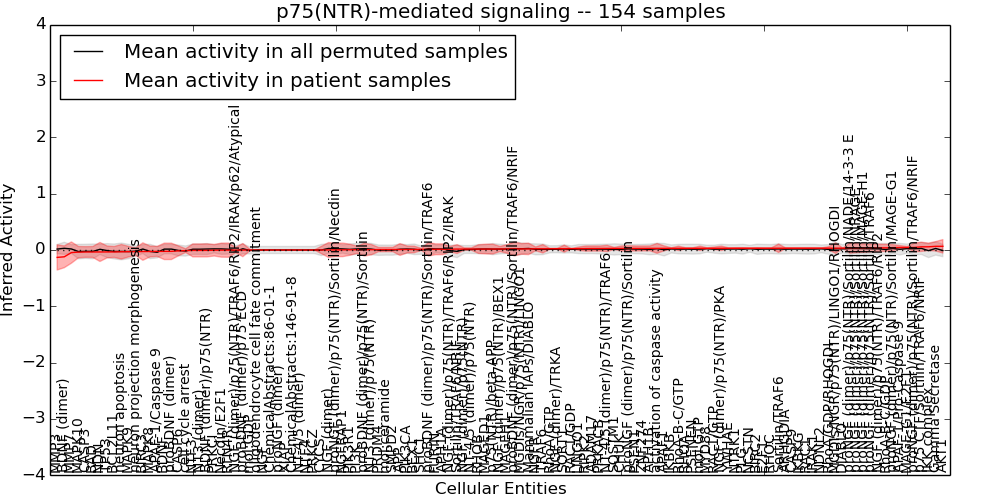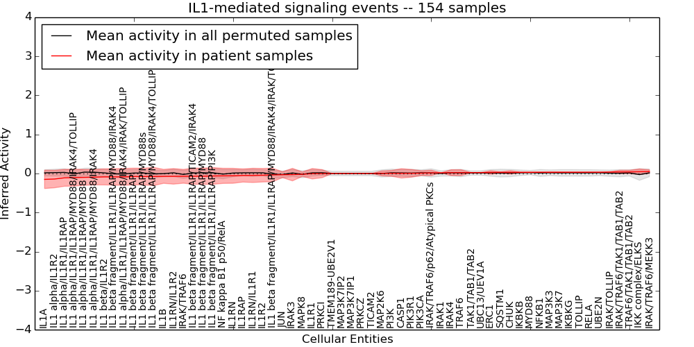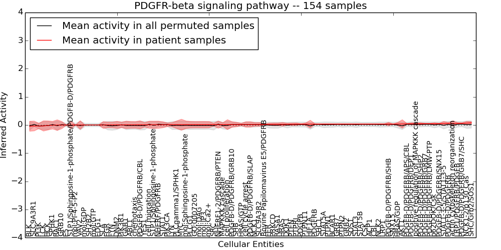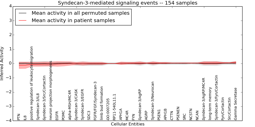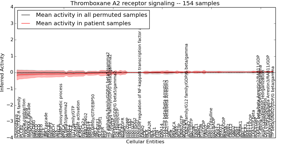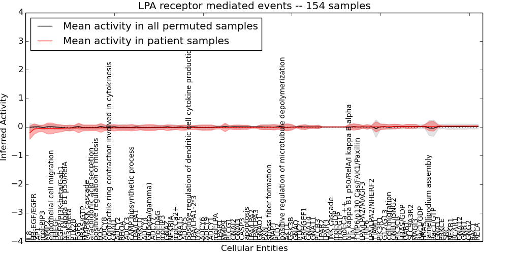 Figure S131. Get High-res Image This plot shows pathway concept perturbations across all samples against a permutation model. The concepts along the x-axis are sorted by lowest to highest mean activity for the real patient samples. Mean inferred activities are plotted along the y-axis as a colored band showing the average level and one standard deviation range. Real samples are shown in red and permuted samples in black.