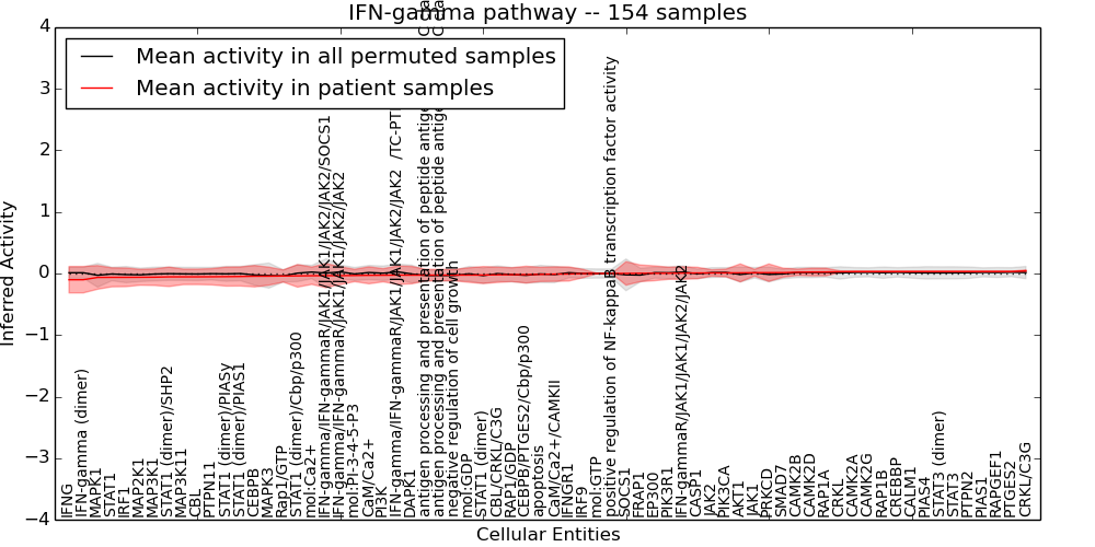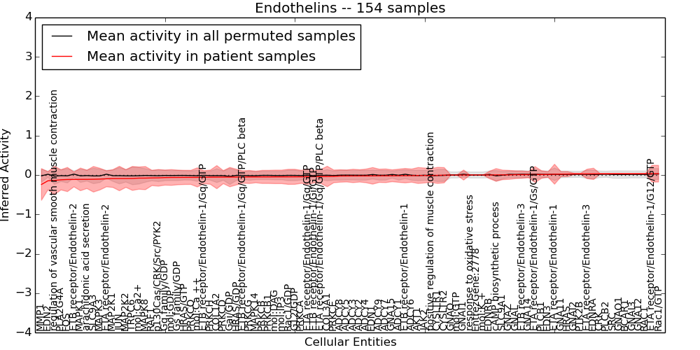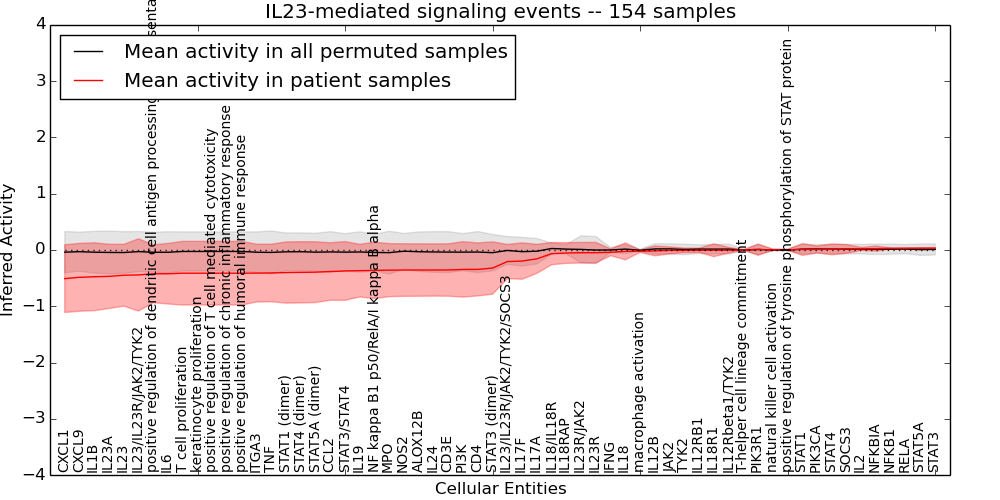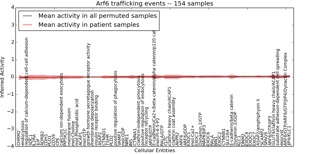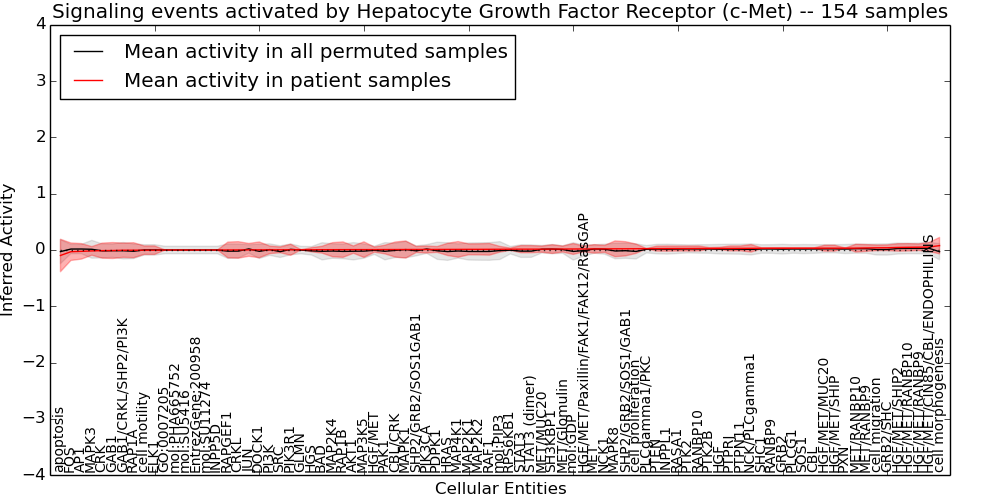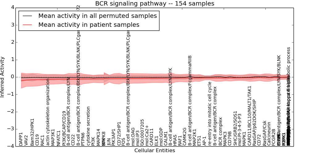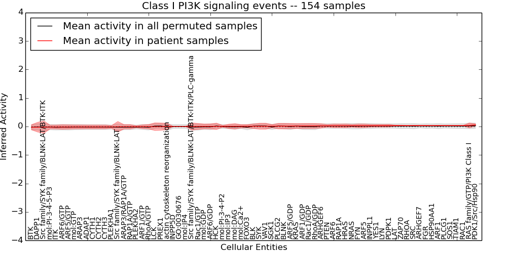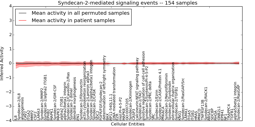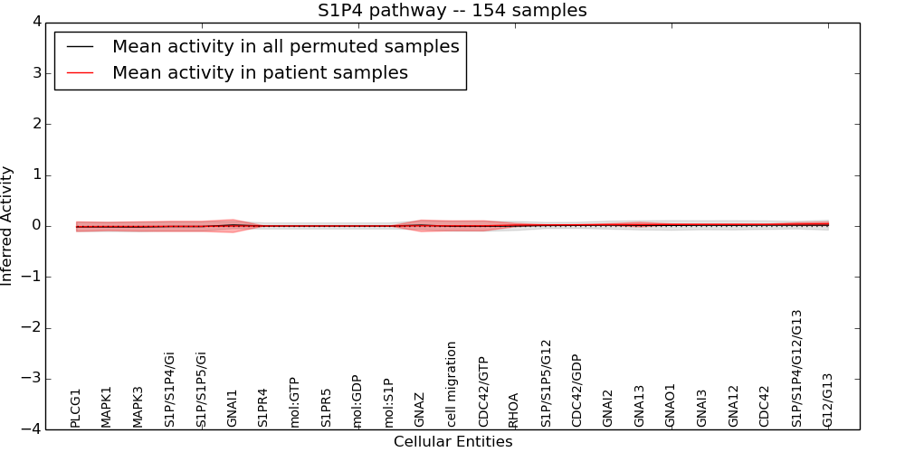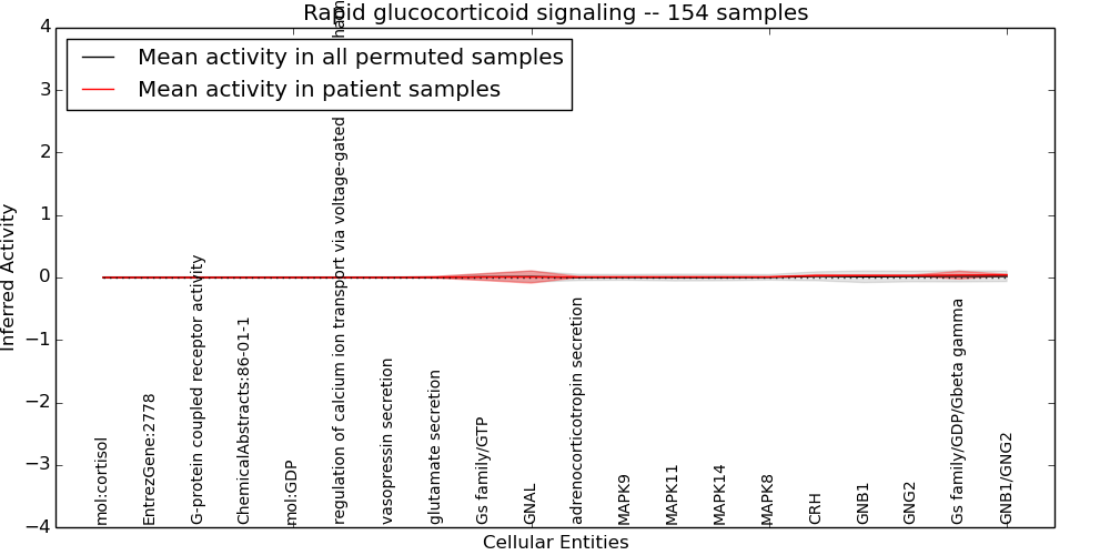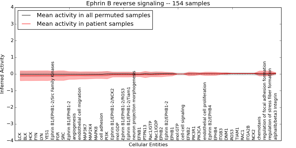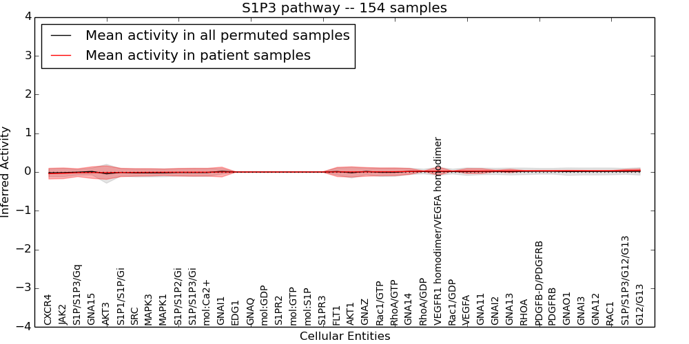 Figure S131. Get High-res Image This plot shows pathway concept perturbations across all samples against a permutation model. The concepts along the x-axis are sorted by lowest to highest mean activity for the real patient samples. Mean inferred activities are plotted along the y-axis as a colored band showing the average level and one standard deviation range. Real samples are shown in red and permuted samples in black.