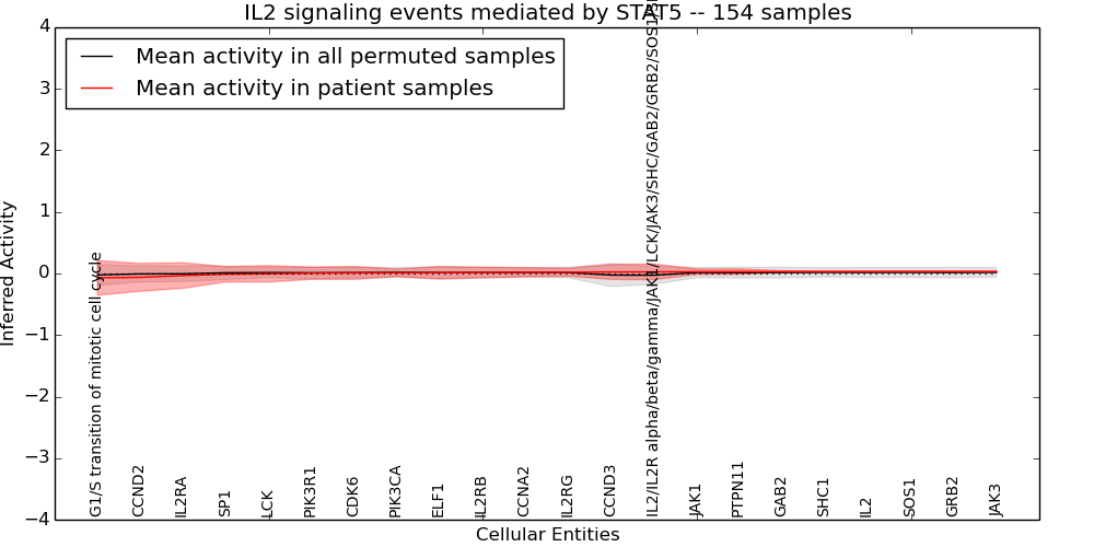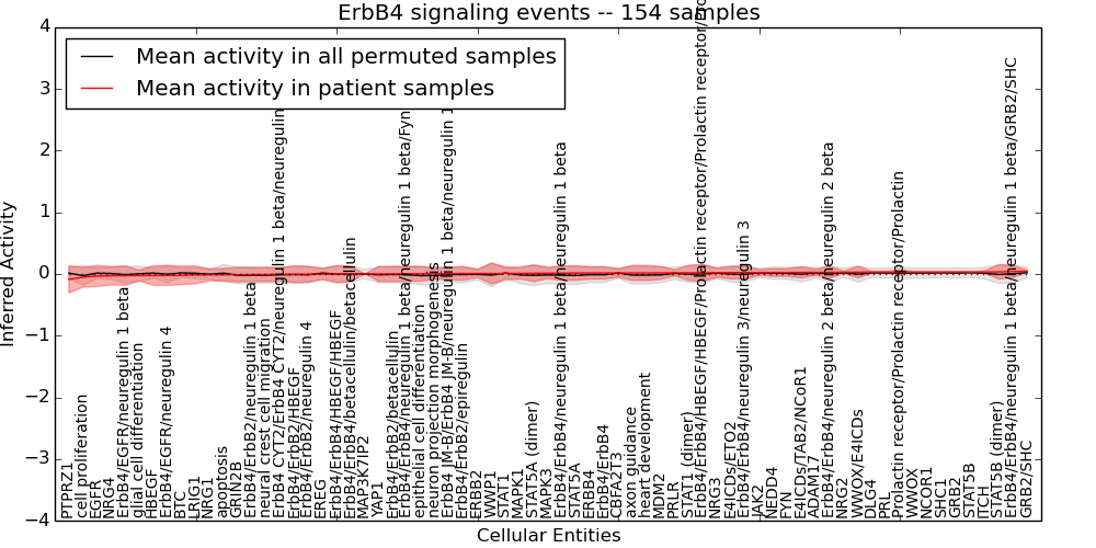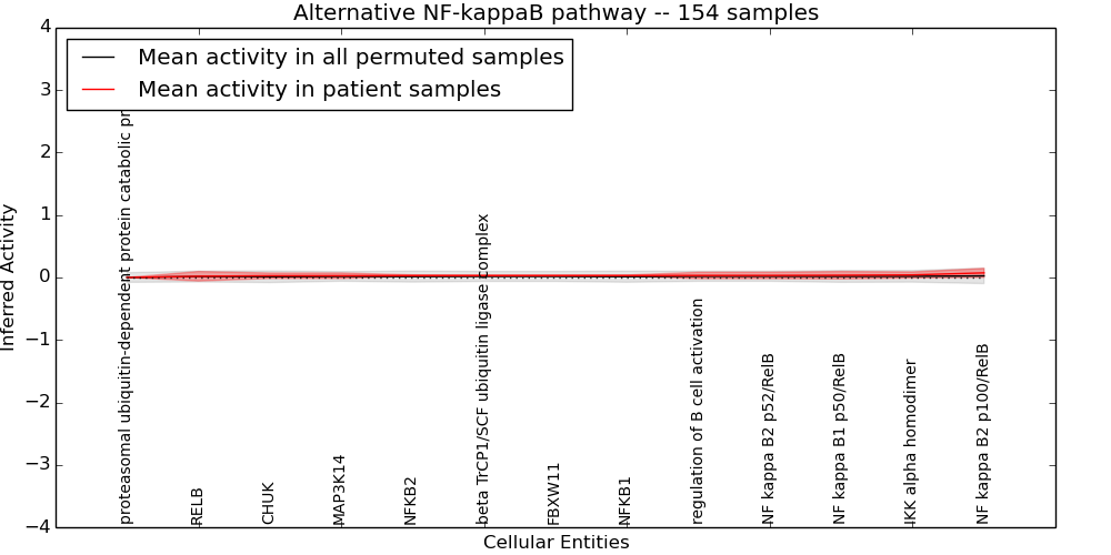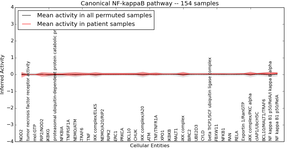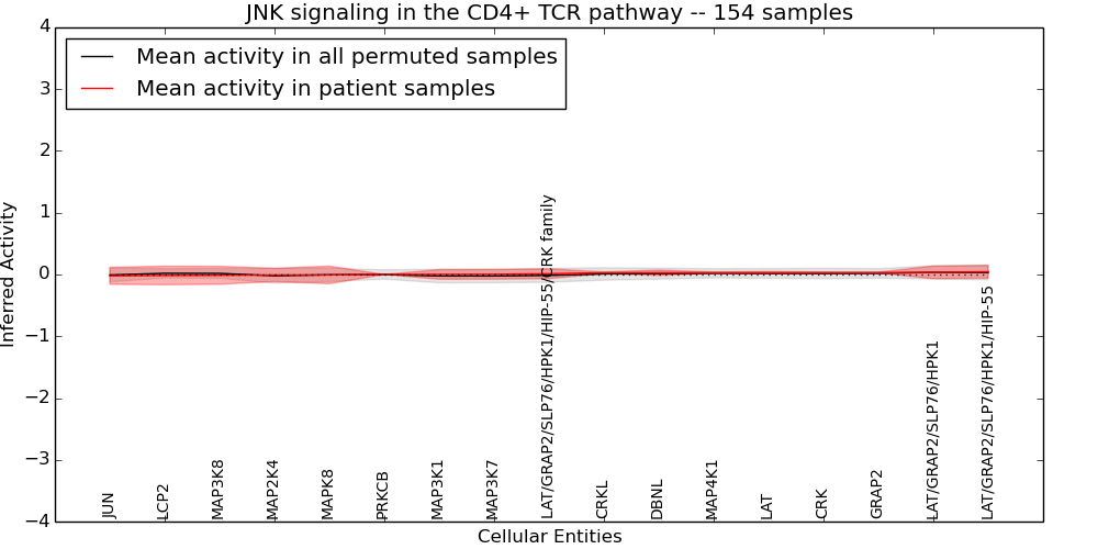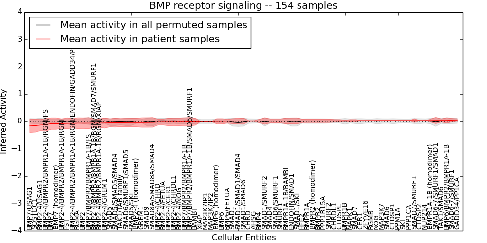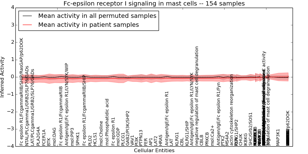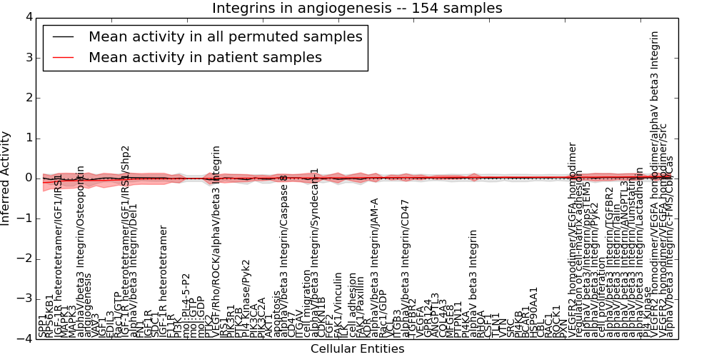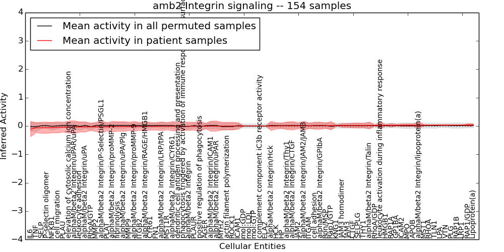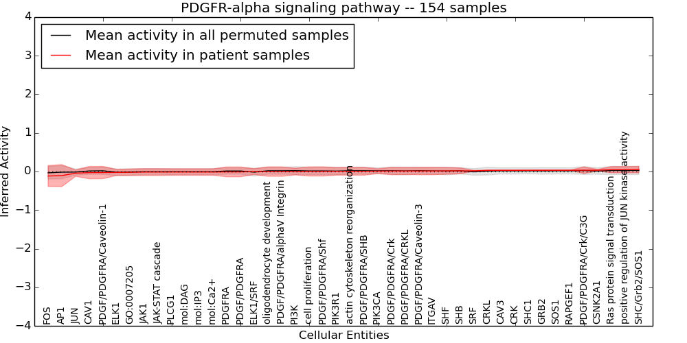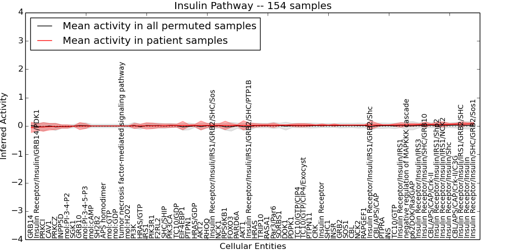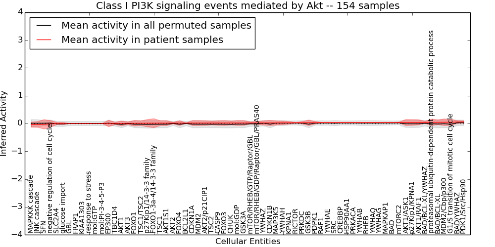 Figure S131. Get High-res Image This plot shows pathway concept perturbations across all samples against a permutation model. The concepts along the x-axis are sorted by lowest to highest mean activity for the real patient samples. Mean inferred activities are plotted along the y-axis as a colored band showing the average level and one standard deviation range. Real samples are shown in red and permuted samples in black.