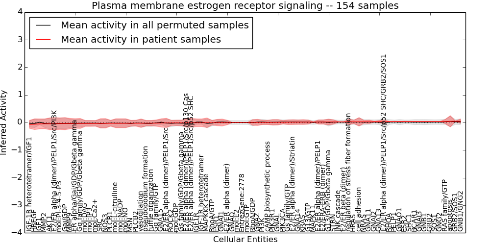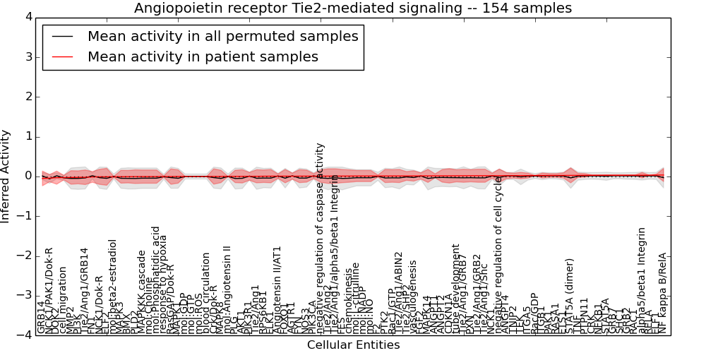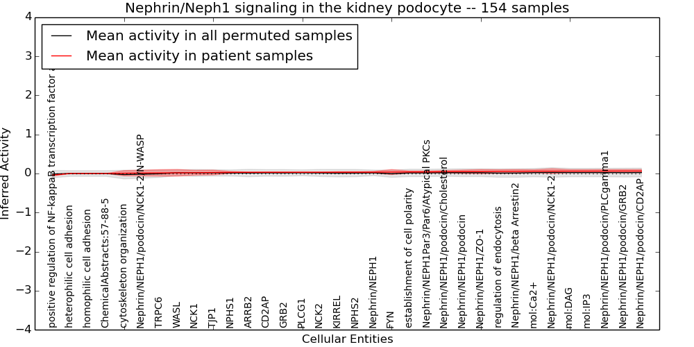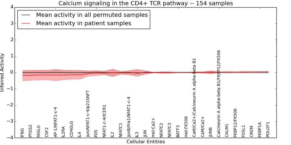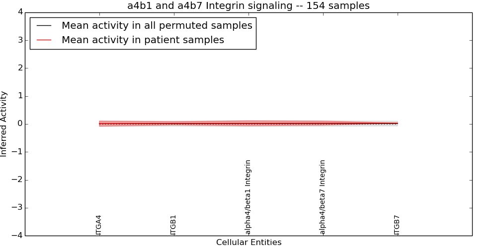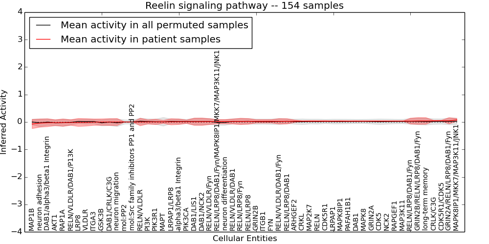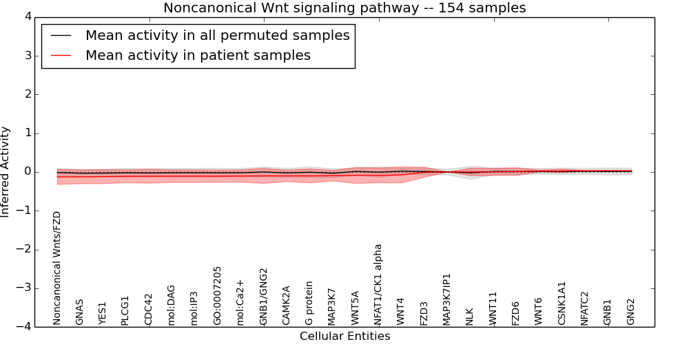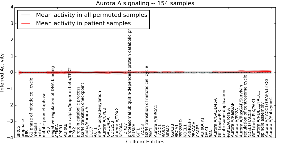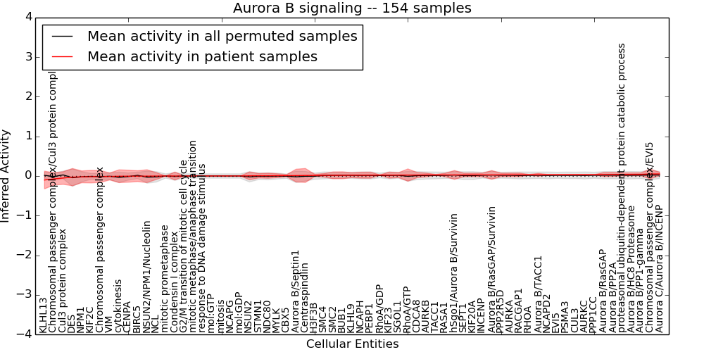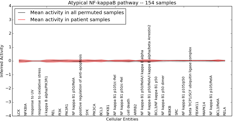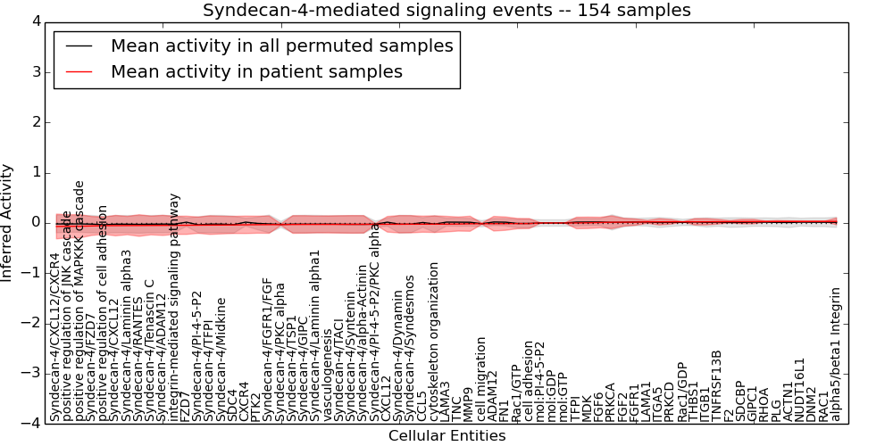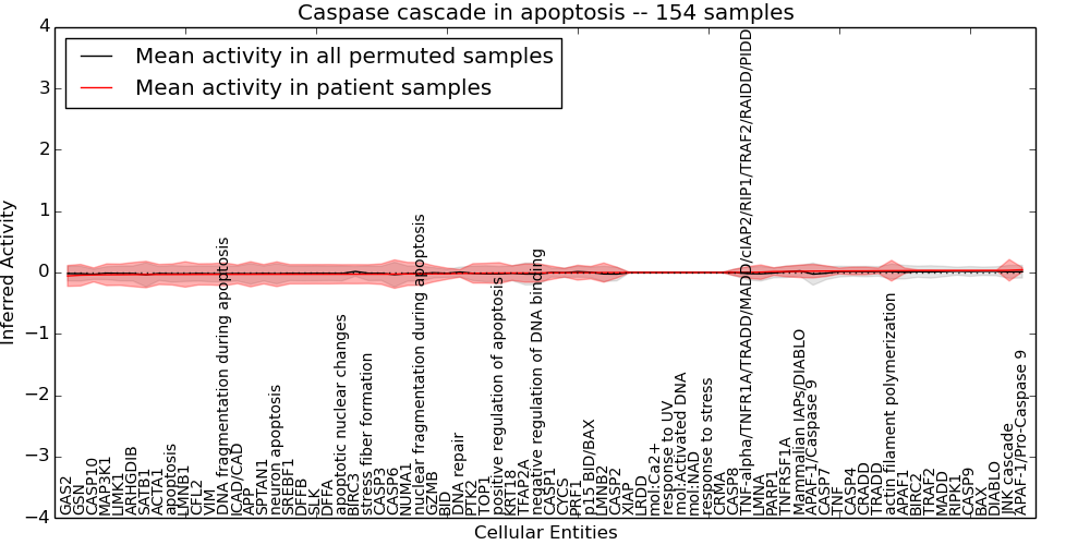 Figure S131. Get High-res Image This plot shows pathway concept perturbations across all samples against a permutation model. The concepts along the x-axis are sorted by lowest to highest mean activity for the real patient samples. Mean inferred activities are plotted along the y-axis as a colored band showing the average level and one standard deviation range. Real samples are shown in red and permuted samples in black.