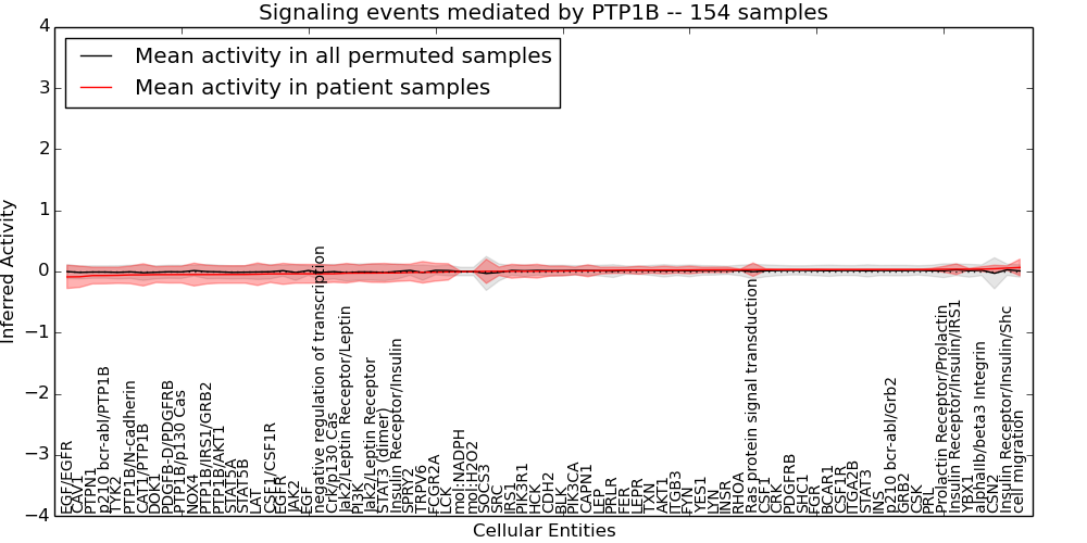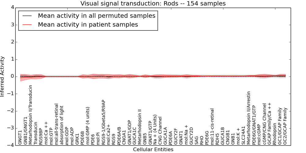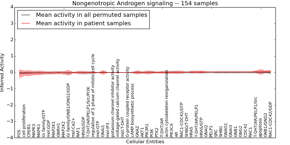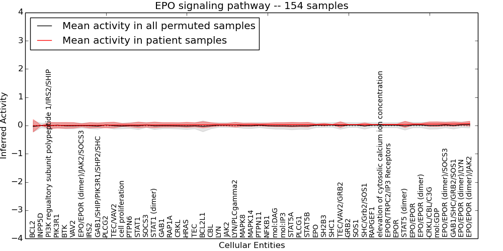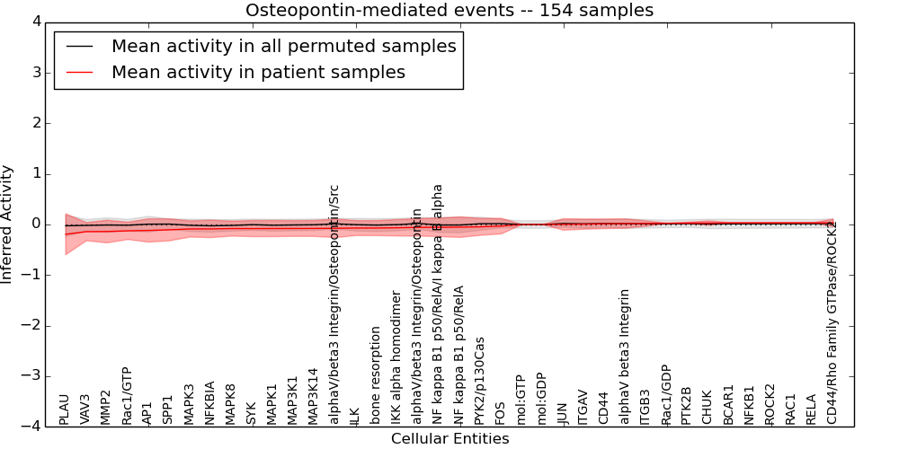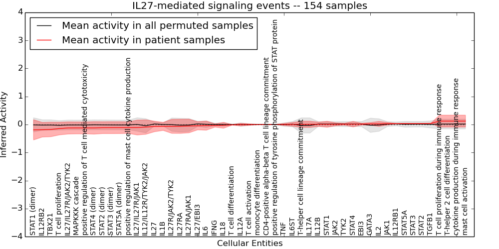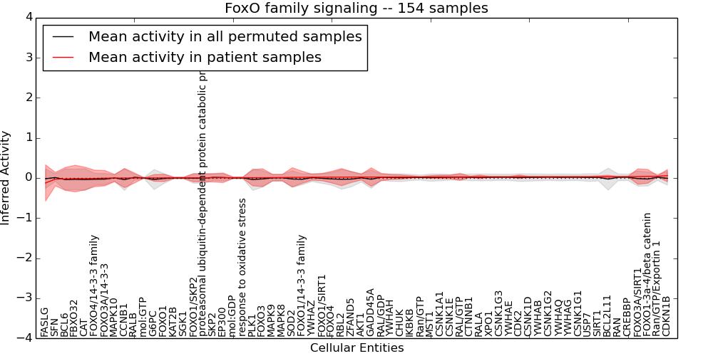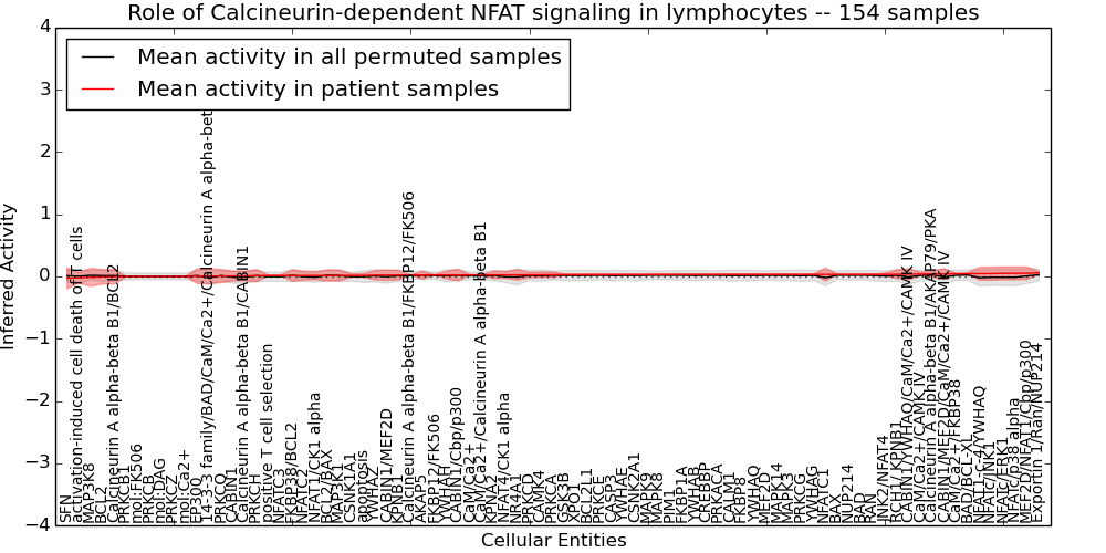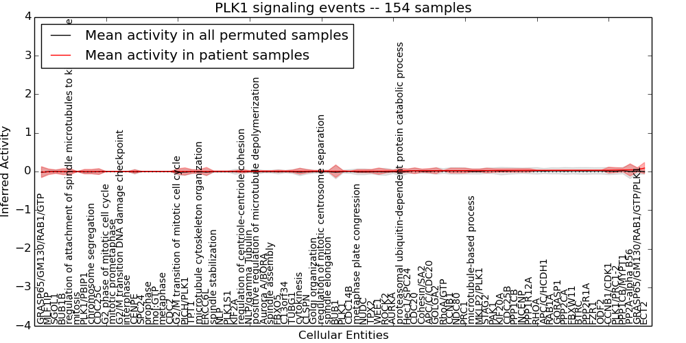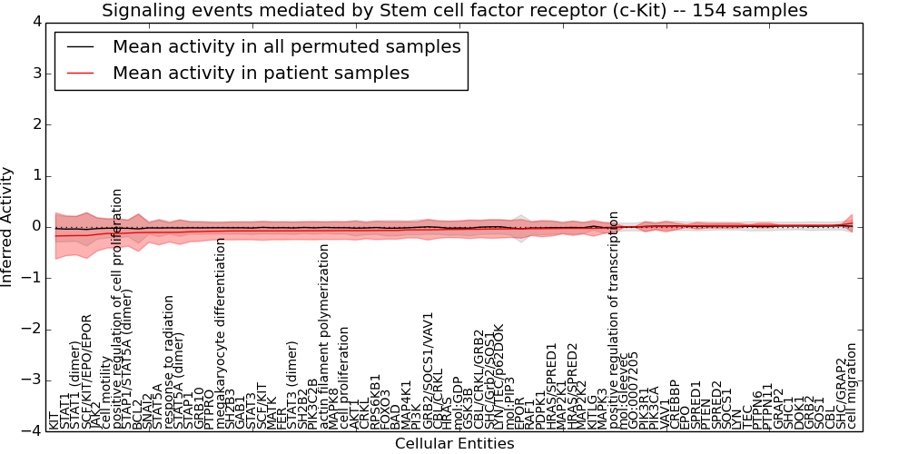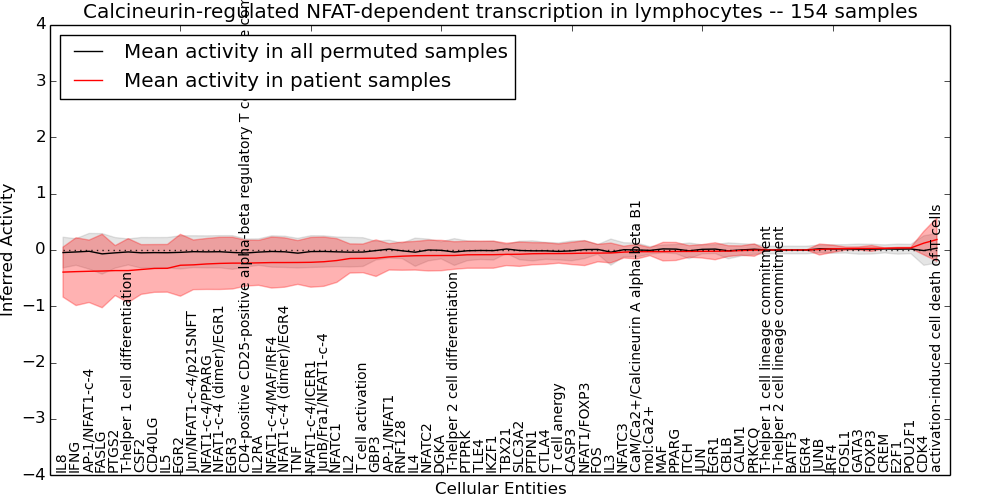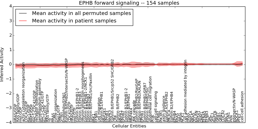 Figure S131. Get High-res Image This plot shows pathway concept perturbations across all samples against a permutation model. The concepts along the x-axis are sorted by lowest to highest mean activity for the real patient samples. Mean inferred activities are plotted along the y-axis as a colored band showing the average level and one standard deviation range. Real samples are shown in red and permuted samples in black.